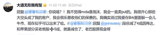 在近期的震荡行情中,关于AI是否存在泡沫的讨论升温,知名投资人段永平也加入其中。日前,他在回复网友时表示:“我不觉得英伟达是泡沫,我会一直卖put的。”