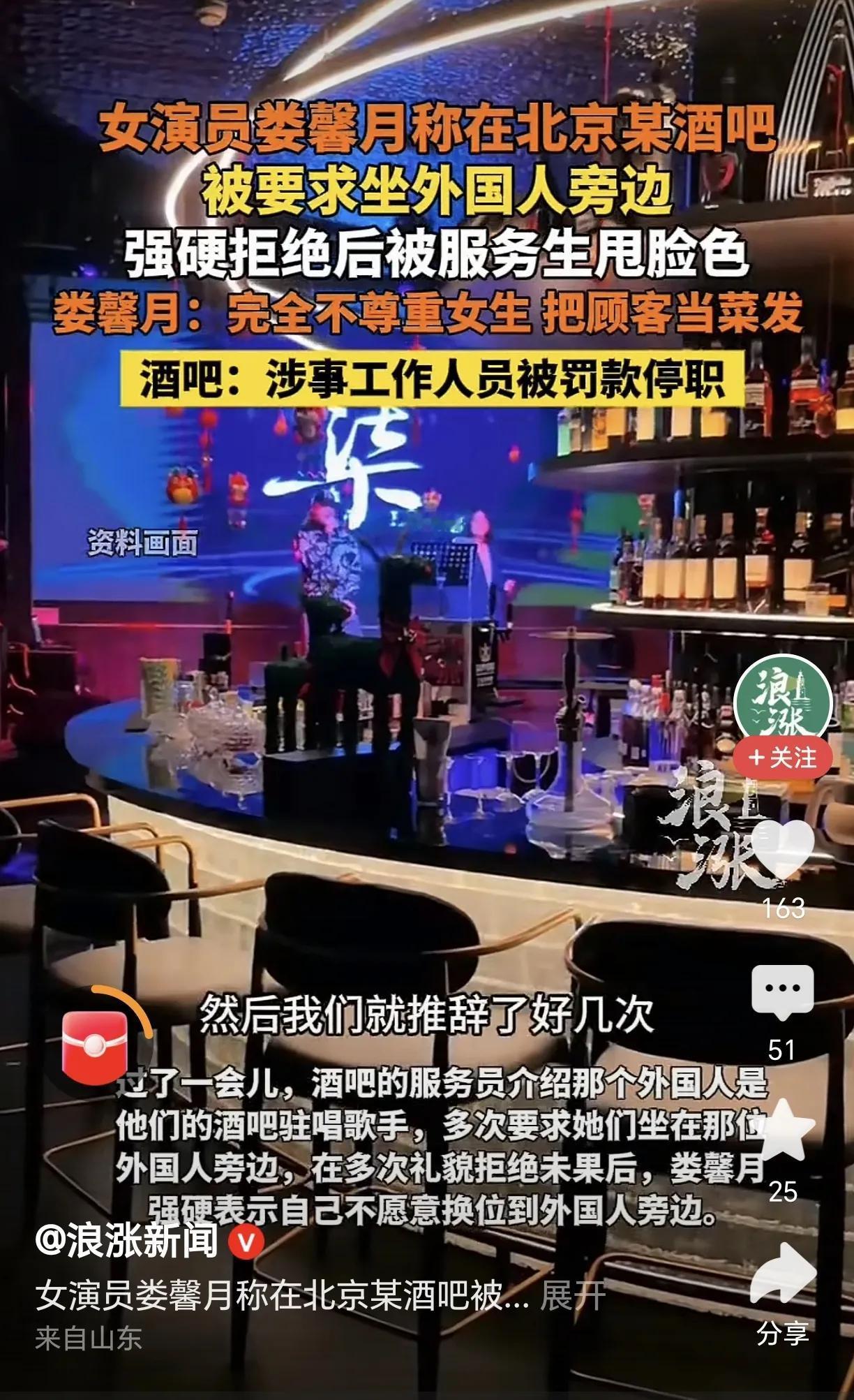 一个女演员到酒吧消费。 结果被酒吧服务员当做送菜一样的,多次要求她更换座位坐到酒吧驻唱歌手旁边,对方还是个外国人。 女演员当场离开,事后酒吧致歉并把那名服务员停职罚款了。 这件事透露出来的问题,足以说明当前社会上有些国人面对外国人时的心里还是跪着的。 尤其是现在我国国门对外更加开放,来华外国人越来越多时更加容易出现类似现象。 而当事人无论是是女演员还是其他职业的女性,都有身为中国公民应该具有的不受人格侮辱的权利。 想要改变改变这样的现象,还需要很长的时间。