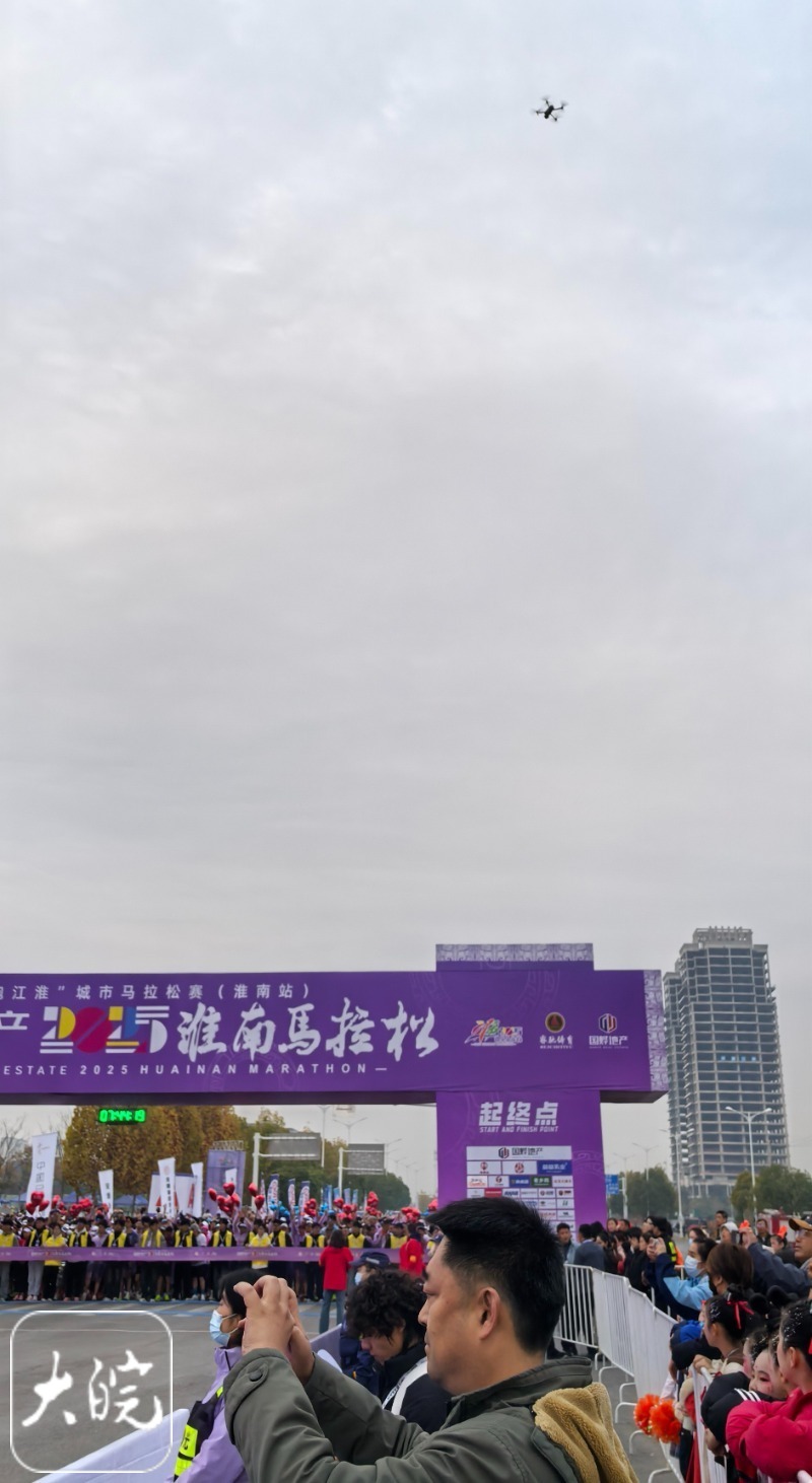 大皖新闻讯11月23日,在淮南市奥体中心北门,2025淮南马拉松鸣枪开跑。当天,记者在现场看到,淮南交警利用无人机在空中护航马拉松比赛。