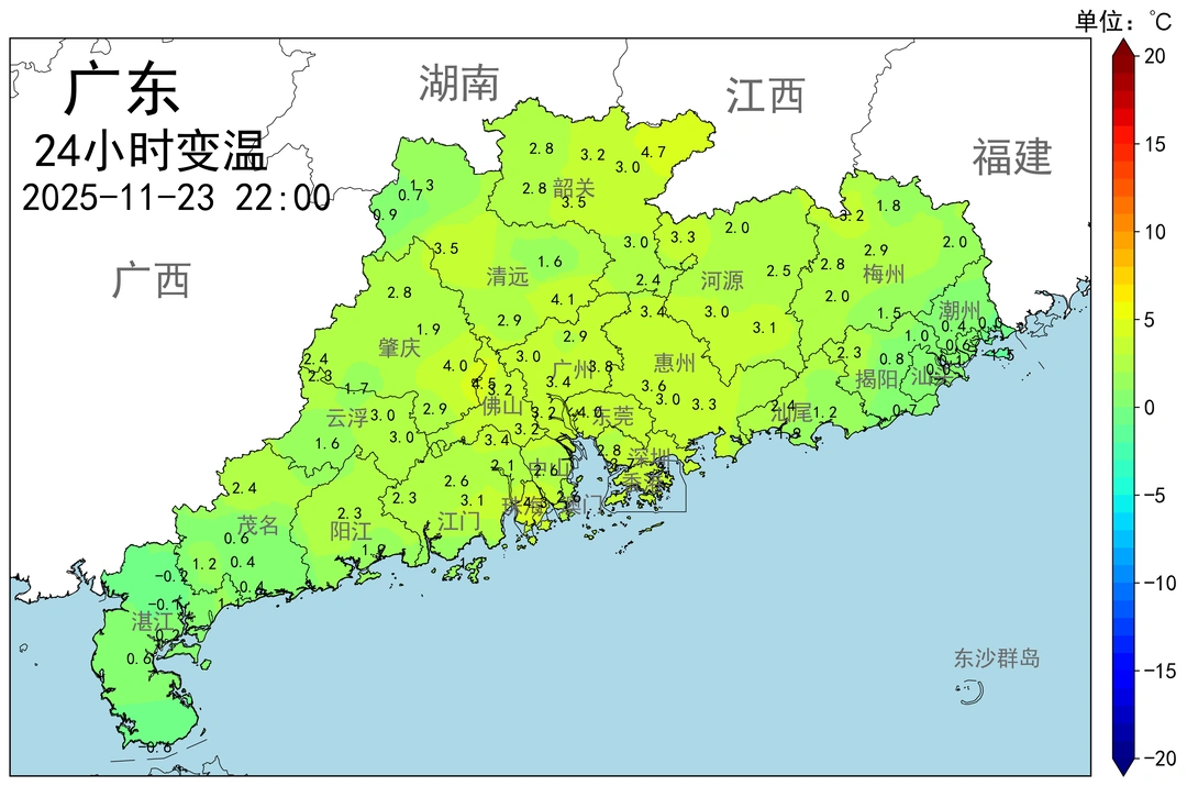 天气多变,真情不变。 本周末(11月22号~23号),广东全省经历了不错的周末,天气是相当温暖的,尤其沿海地区下午在太阳照耀下,人体感觉略显炎热,沿海地区的短袖又开始蠢蠢欲动了。 即便是明天周一(24号),沿海地区的伙伴,即便穿短袖,也是情理之中,因为确实气温回升的力度很大,寒潮之后,平均有8~11度升温幅度。 然而,一股弱冷空气将在周一(11月24日)下午到达粤北,当天深夜/周二早上到达广东沿海。周二开始,注意做好保暖工作,且每天穿的衣服“保暖指数”可以适当提高。 此次冷空气虽然比较弱,但会缓慢的,持续的补充南下。广东沿海下周一深夜开始,全省自北向南将将以2~3/天的速度降温,天气逐步转冷,且降温将持续到周四(27号),合计下来,累计有6~8度降温。 受持续弱冷空气影响,下周广东天气以“晴天/少云🌞,干冷,阵性大风,昼夜温差大,早晚比较寒冷,白天相当暖和(粤北昼夜温差可达到12-14度,沿海地区昼夜温差在10度左右) 另外,本周可能新诞生一个台风,并且将在周四之后逐步影响南海中部,受其影响,周六(29号)开始,广东沿海地区的云量逐步增加,转为多云天气,早晚较冷,中午暖和,同时东北风也会逐步明显,但对气温整体影响偏小。 因此,下周广东的小伙伴,主要需要做好防寒保暖工作,天气相当干燥(每天相对湿度大致在30%~65%轻微浮动),注意做好保湿,多喝水,且做好“静电”防范。