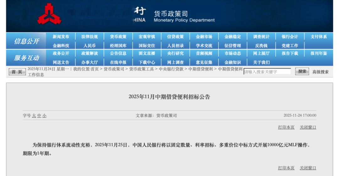11月24日,央行发布消息称,为保持银行体系流动性充裕,2025年11月25日,中国人民银行将以固定数量、利率招标、多重价位中标方式开展10000亿元MLF操作,期限为1年期。