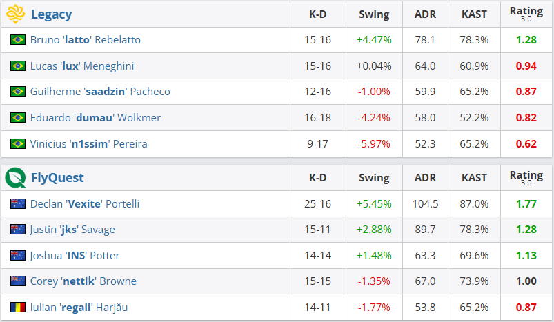 下半场Legacy拿下手枪局后,一度将比分扩大至10-4,但FlyQuest凭借nettik和jks的双人四杀完成了一分无甲手枪eco局翻盘,随后比赛直接进入两极反转,Legacy此后再未拿到任何一分,FlyQuest全员复苏最终完成了13-10的绝地翻盘,拿下开门红的同时晋级1-0组。