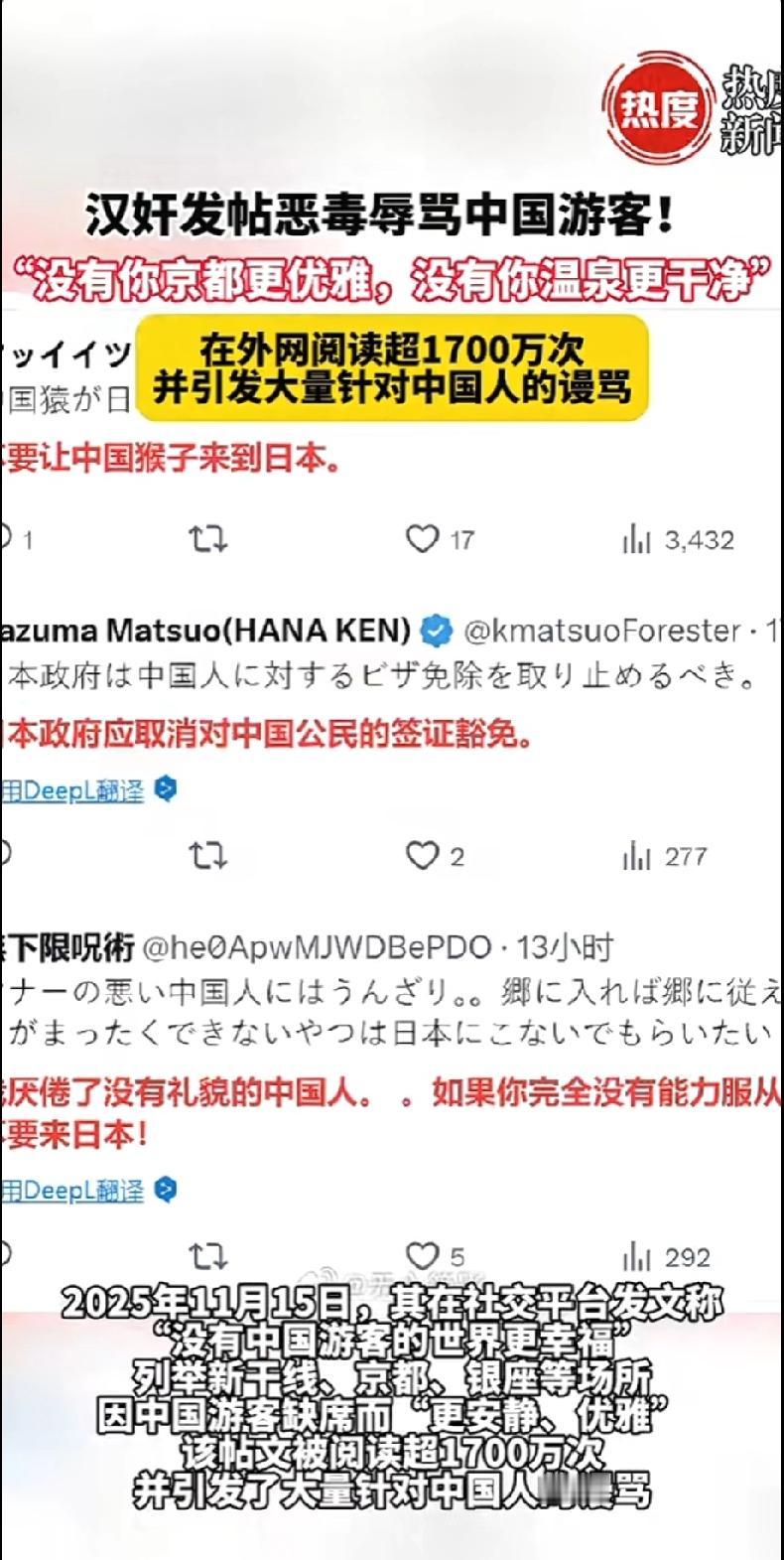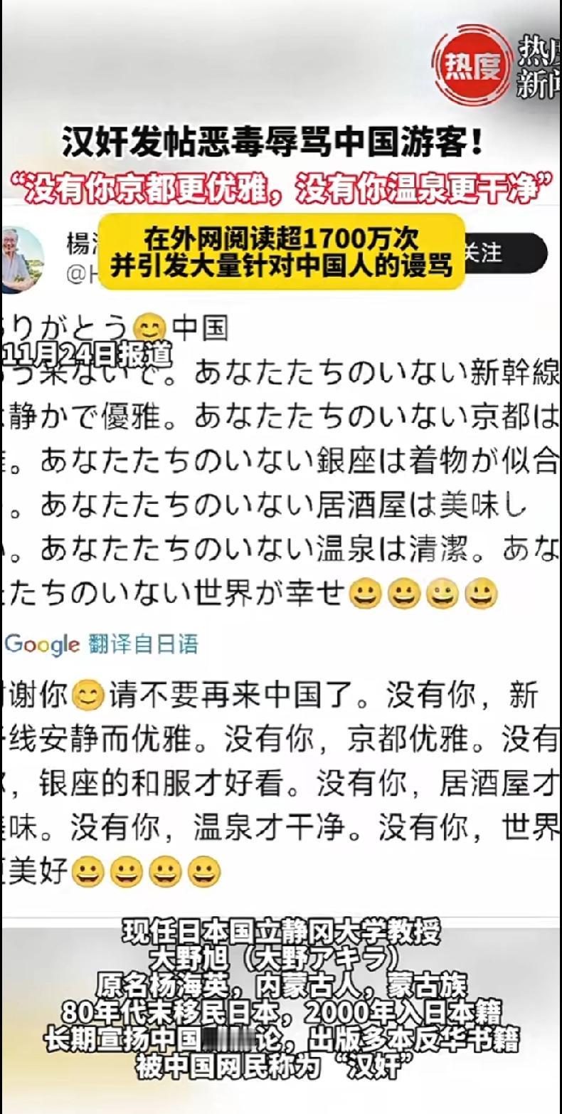 现在还坚持去日本旅游的玩意,无疑就是心甘情愿的想为日本人多造几颗子弹! 另外,面对汉奸的谩骂,他们或许心里想的只是,如何证明自己能比老牌汉奸更汉奸,并坚信自己一定能够证明,于是,便洋洋得意起来,不再理会老汉奸的谩骂!