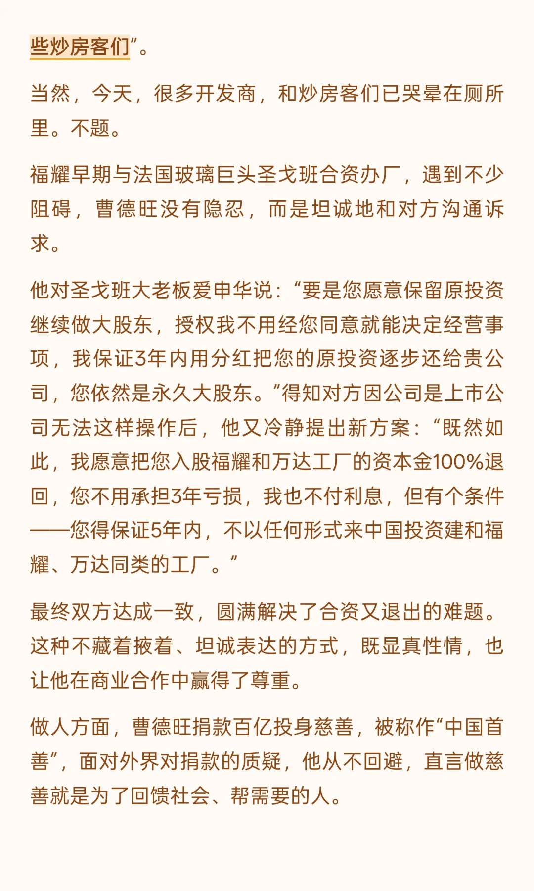 曹德旺曾谈房地产:“房地产本来就是为了造福民生的,但是现在最赚钱的不是卖钢筋和水泥砖头的实体行业。真正躺着赚钱的,是金融机构,开发商以及那些炒房客们”。