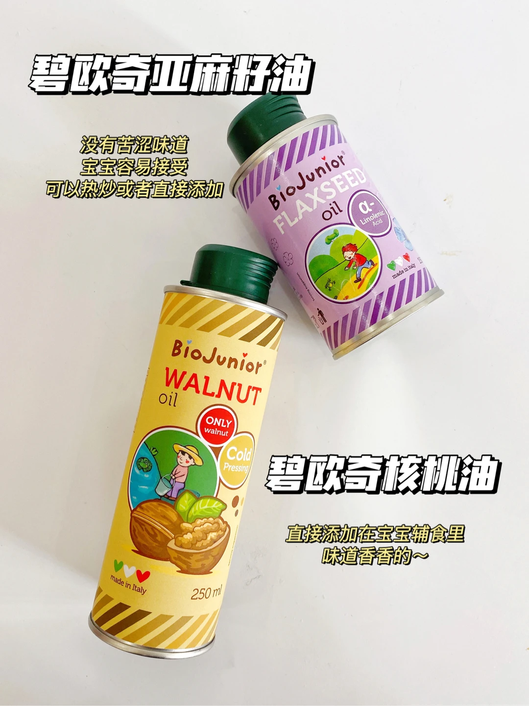 ☑️碧欧奇核桃油、亚麻籽油:不用多介绍想必宝妈们也都知道。成分中的不饱和脂肪酸含量高达90%,直接添加在辅食里,味道香香的。亚麻籽油可以用来热炒,油质清澈,口感顺滑,一点苦味都没有。