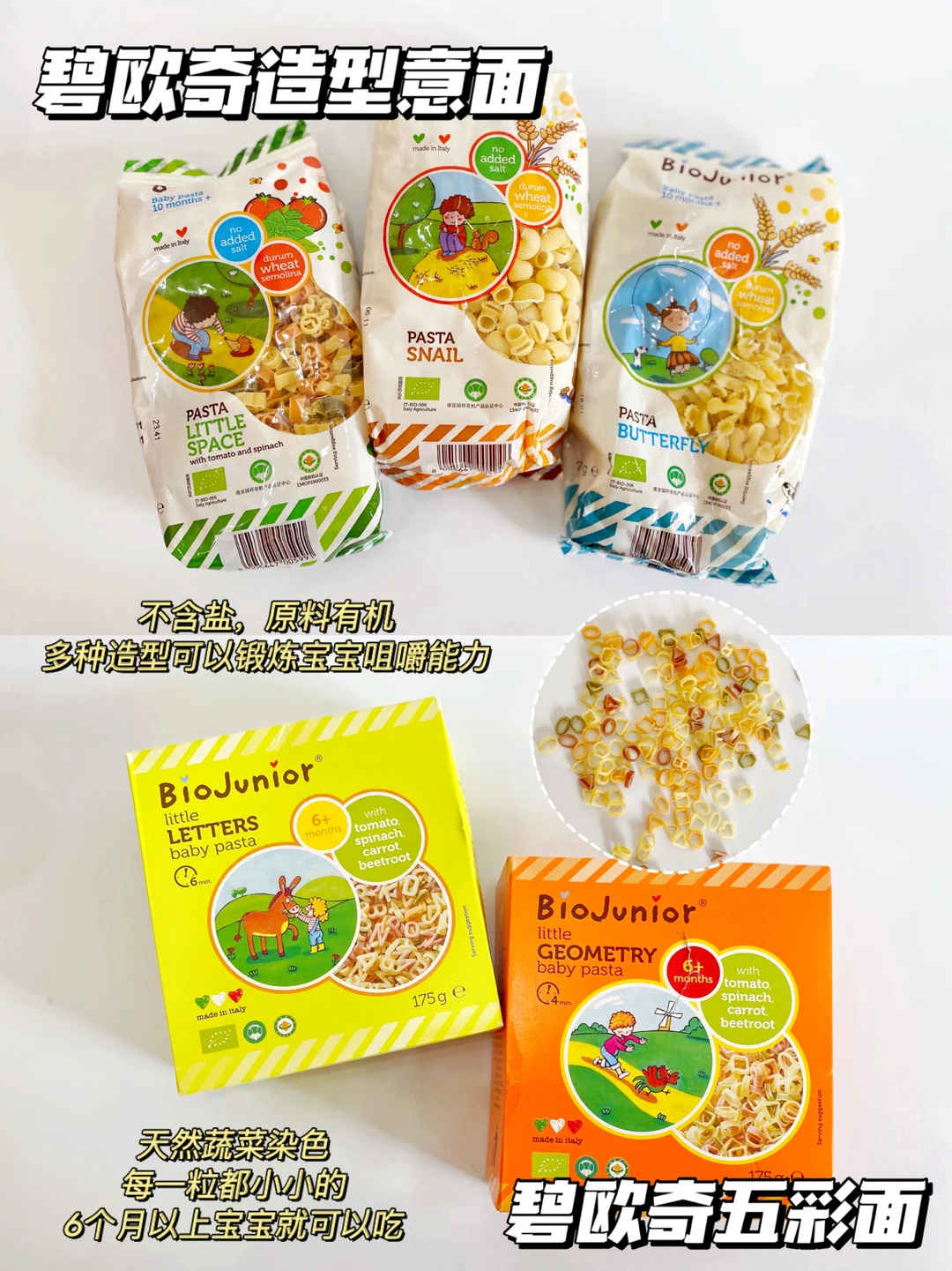 ☑️碧欧奇意面、五彩面:意面已经不知道吃了多少袋了,这种有嚼劲的意面适合10个月以上的宝宝,不含盐口感好。如果6个月以上的宝宝就可以选择五彩面,我也经常会用五彩面做汤面,每一粒小小的也容易消化。水果蔬菜染色不含盐。