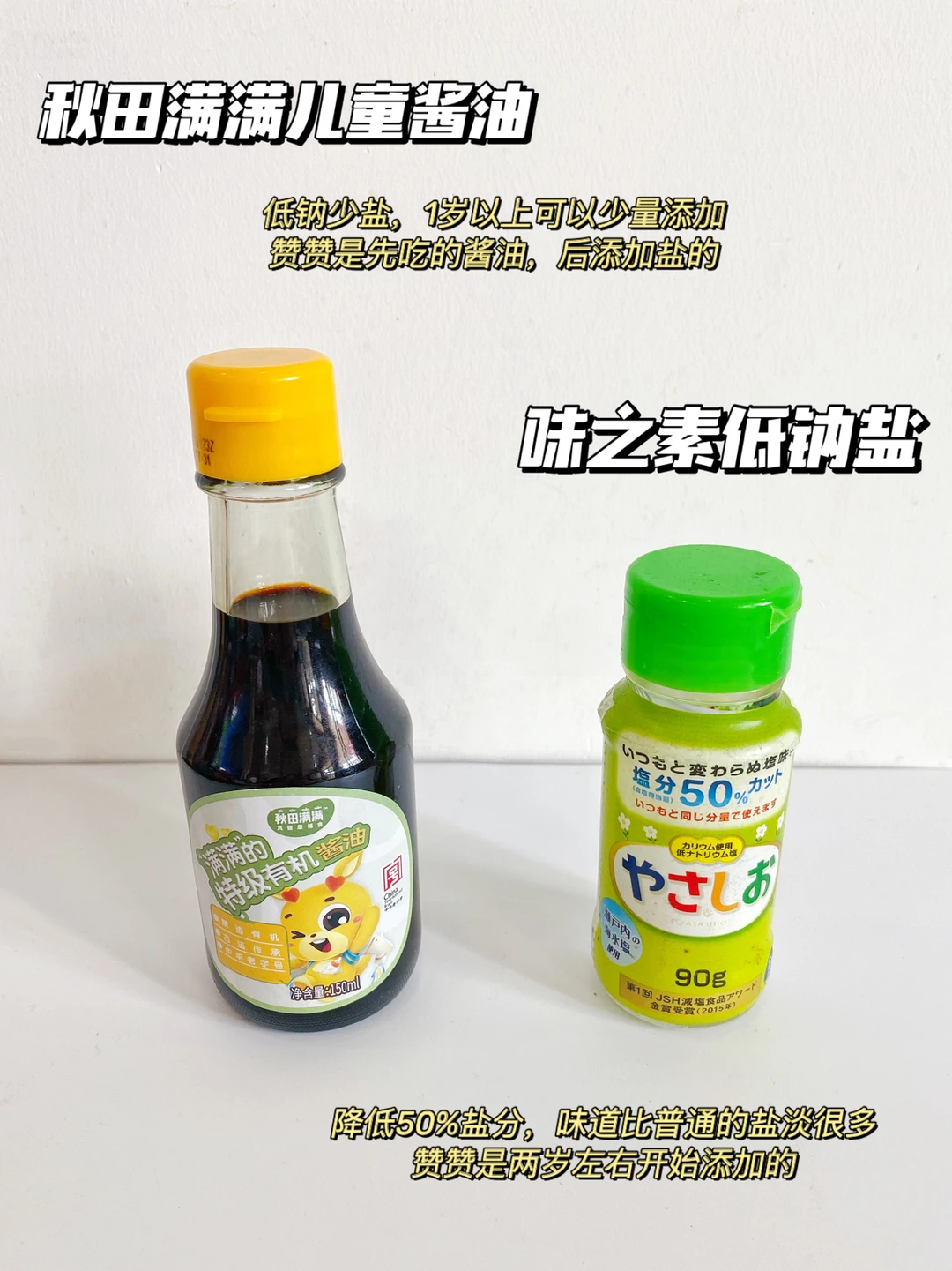 ☑️秋田满满儿童酱油:低钠少盐,口味比较淡,1岁以上可以少量添加。