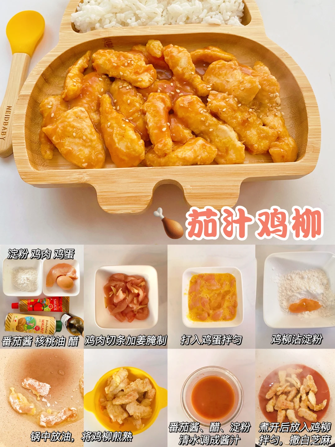鸡肉、鸡蛋、淀粉、姜、番茄酱、核桃油、宝宝醋