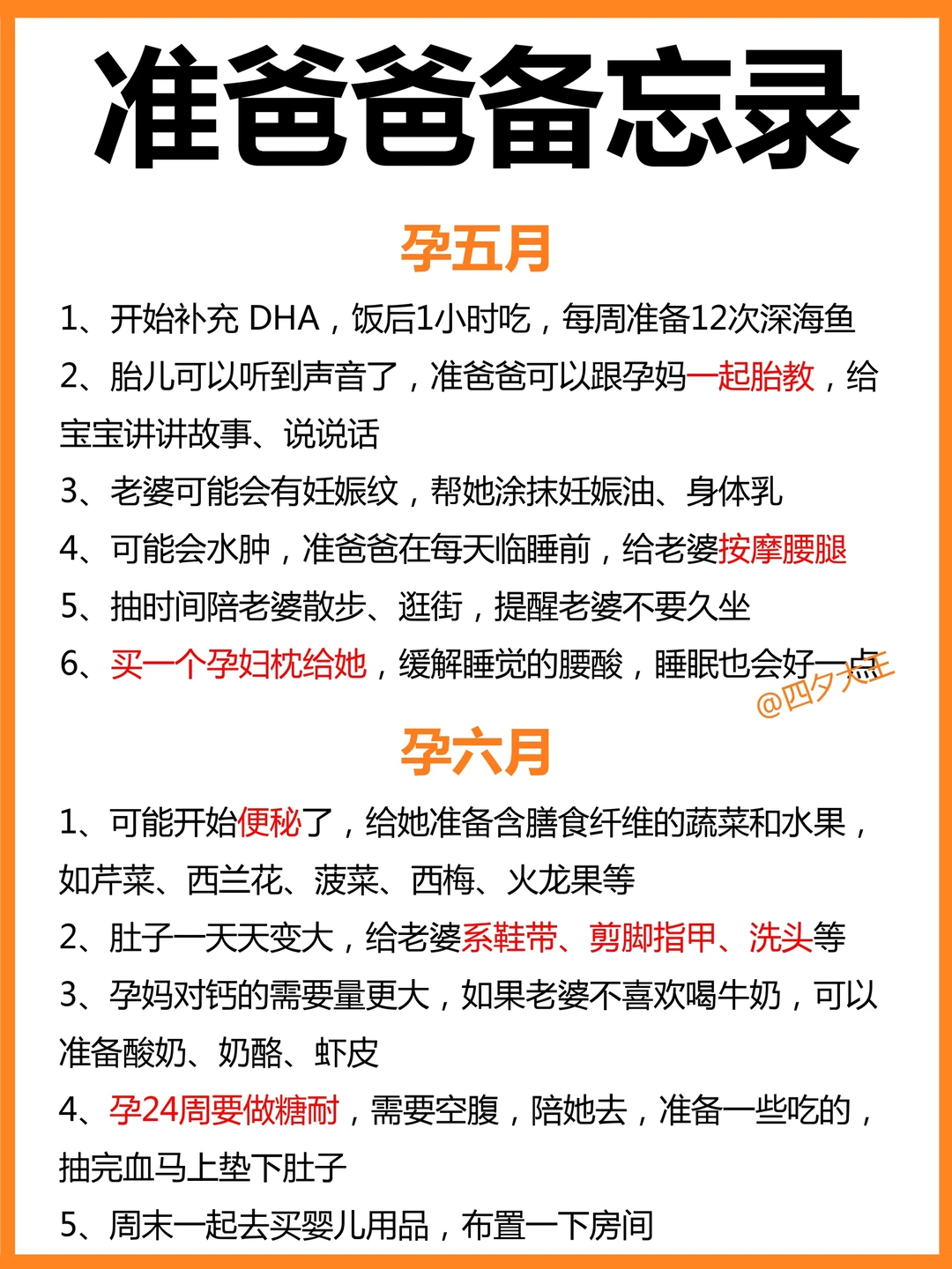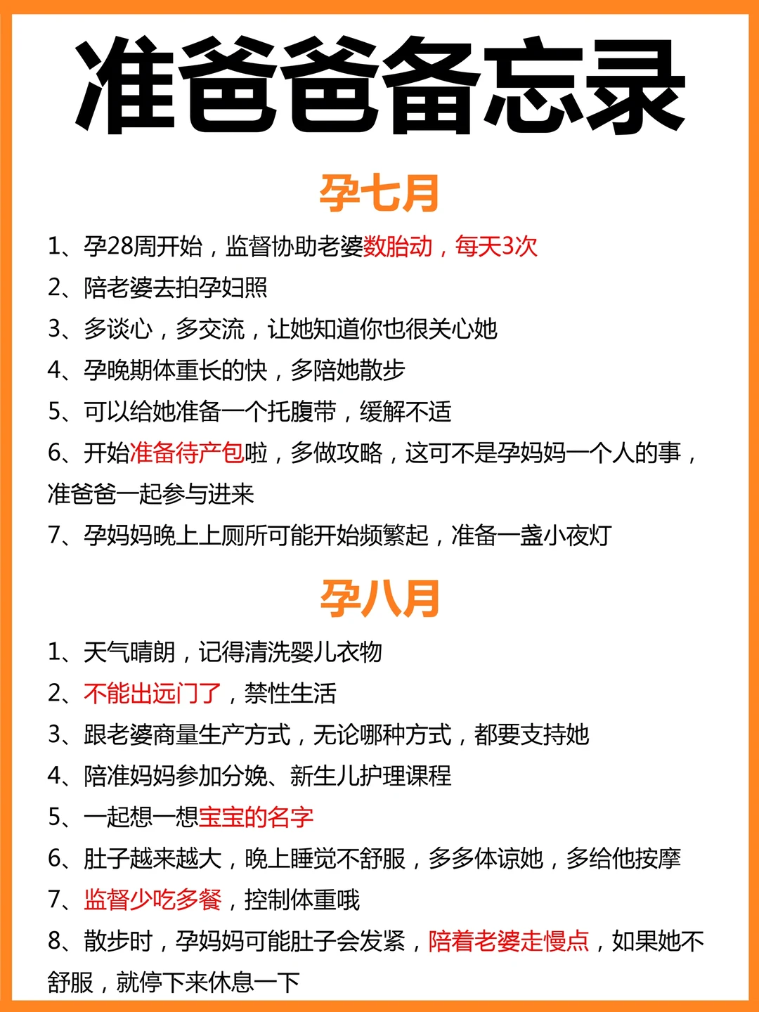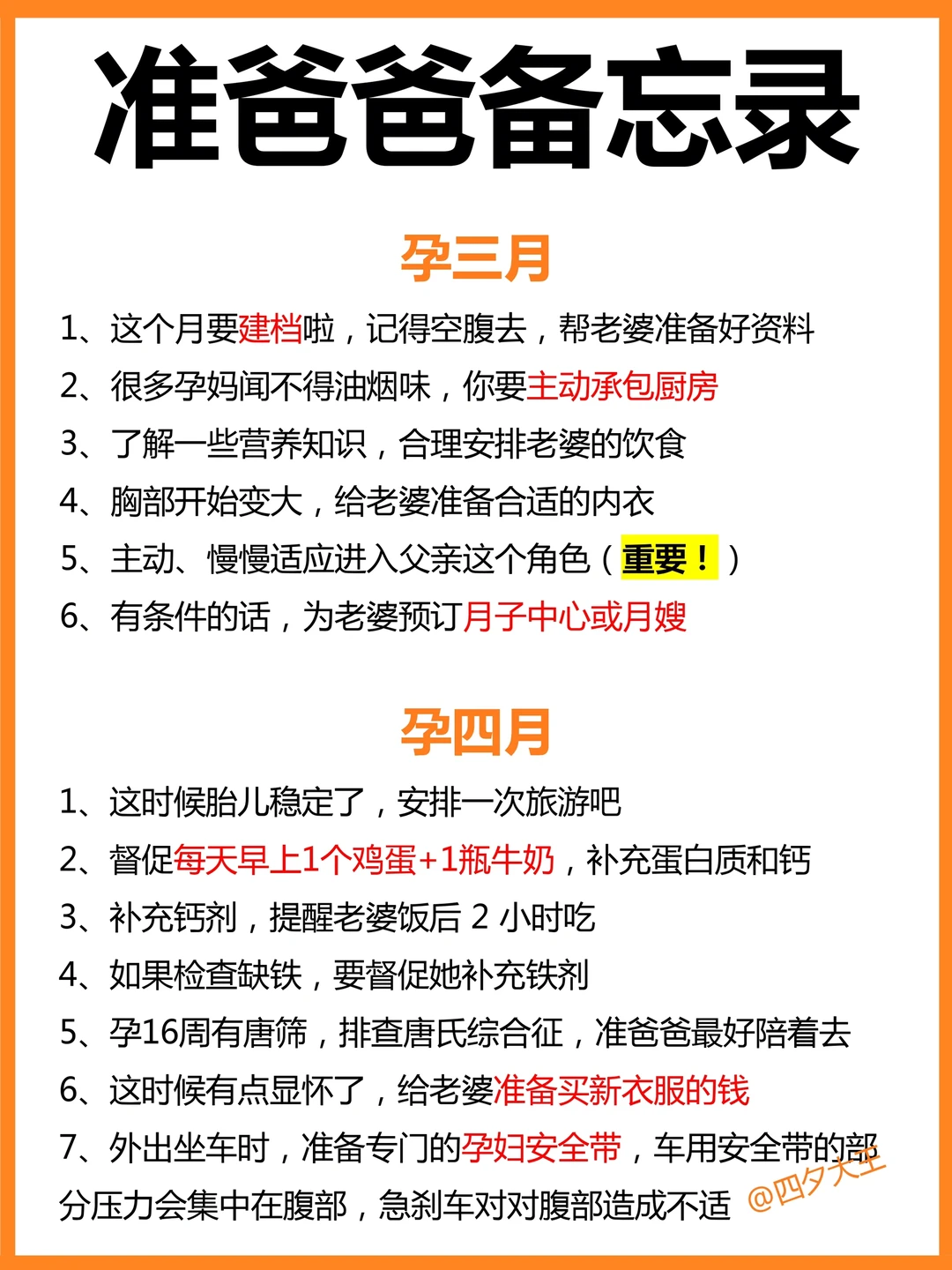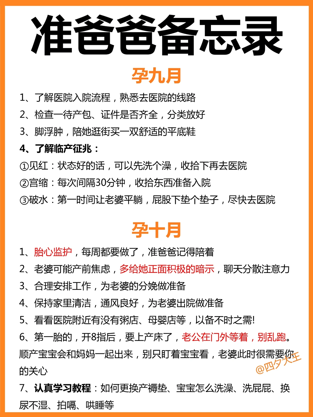 . 👉怀孕的姐妹,快转给老公抄作业‼️ 👉1月-10月准爸爸备忘录 ✔️打印版!收藏版! . ⭕简单总结下,准爸爸必做事项: ✅提前准备孕产知识 ✅改掉不良习惯 ✅陪同产检 ✅主动承担家务 ✅给孕妇按摩身体 ✅给准妈妈洗脚、剪指甲等 ✅一起胎教 ✅陪伴散步 ✅陪着逛街,为待产做准备 ✅安抚准妈妈敏感情绪 ✅做好护理&育儿功课 . 我会持续更新孕育干货 关注我,新手妈妈不迷路