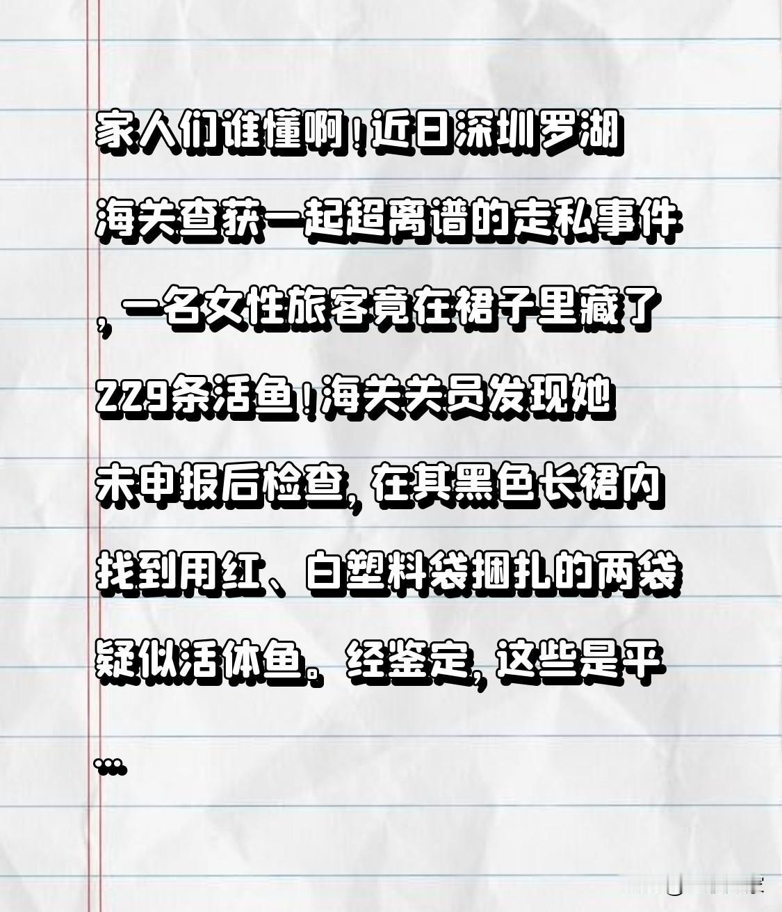 家人们谁懂啊!近日深圳罗湖海关查获一起超离谱的走私事件,一名女性旅客竟在裙子里藏了229条活鱼!海关关员发现她未申报后检查,在其黑色长裙内找到用红、白塑料袋捆扎的两袋疑似活体鱼。经鉴定,这些是平鳍鳅科鱼,是适应急流的淡水鱼,多分布于亚洲山区溪流,也是特色观赏鱼。但这可是禁止进境物啊! 真好奇她为啥想出这么奇葩的藏匿方式,也不知道背后有没有更大的走私团伙。大家说,她会受到怎样的处罚?水产品走私为何屡禁不止?该如何加强监管防止此类事件再次发生? 走私品 走私物品 走私内幕 走私货物 走私货 走私珠宝 走私珠宝首饰