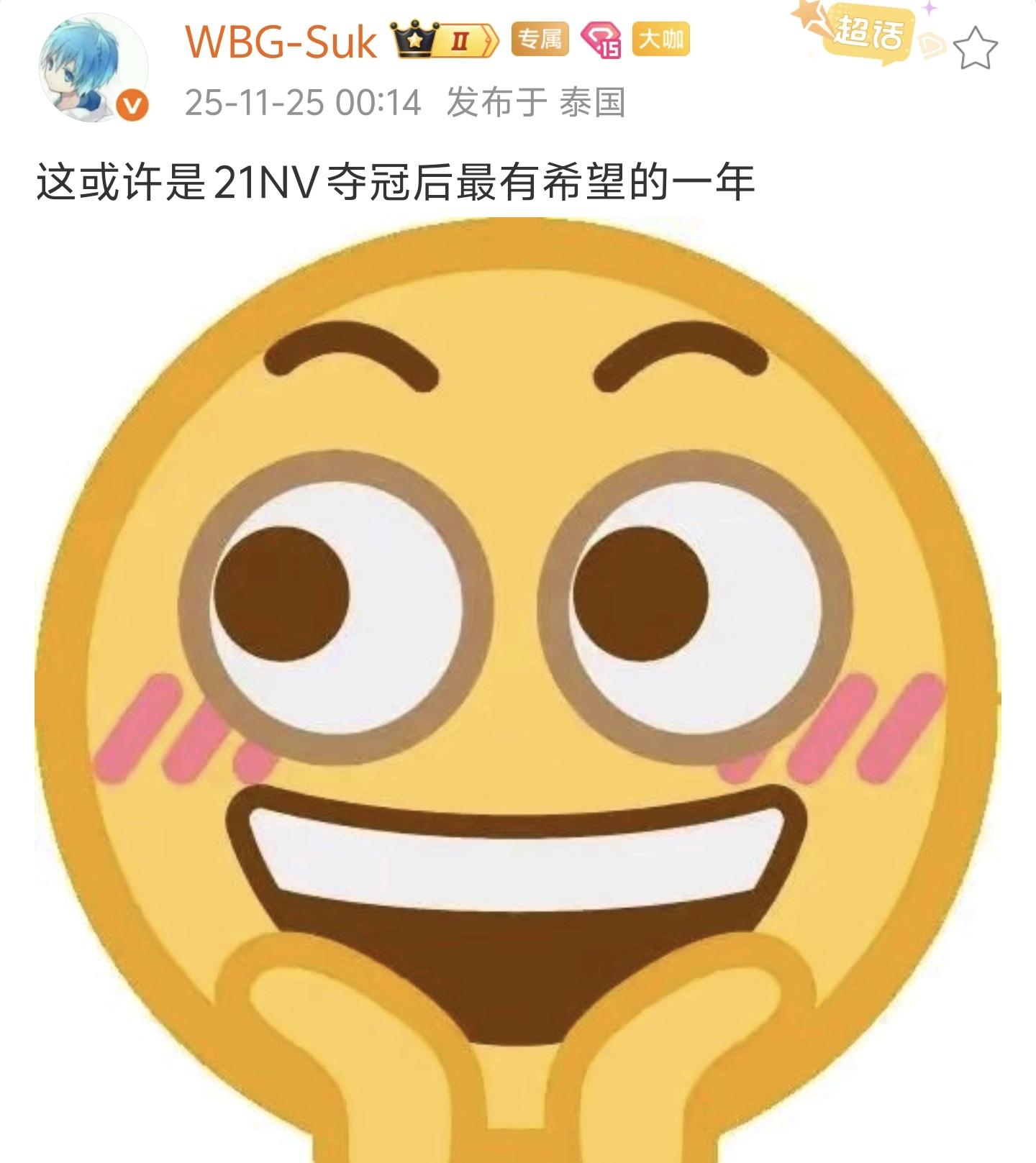 虎扑11月25日讯WBG-Suk精英赛首日赛后发文:这或许是21NV夺冠后最有希望的一年。
