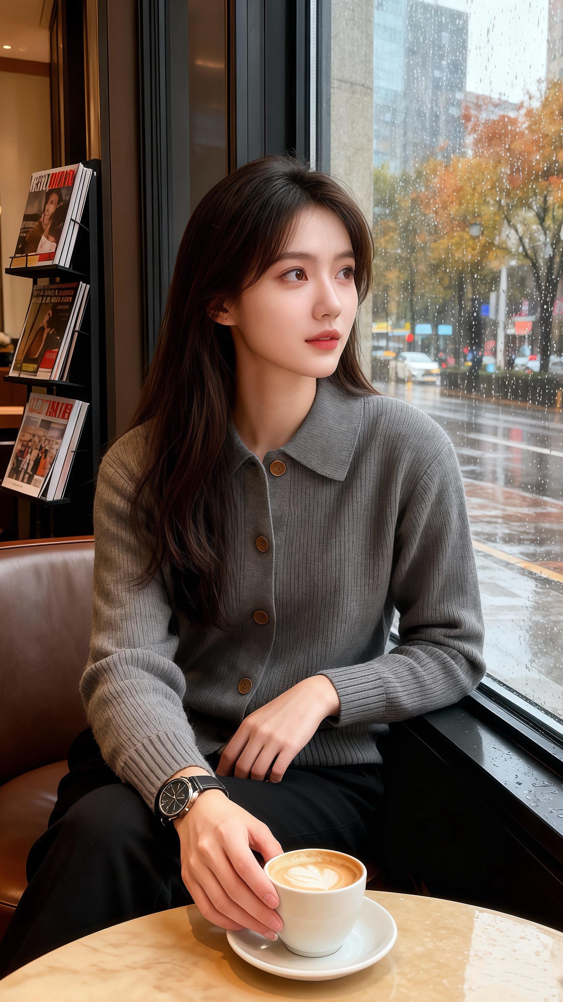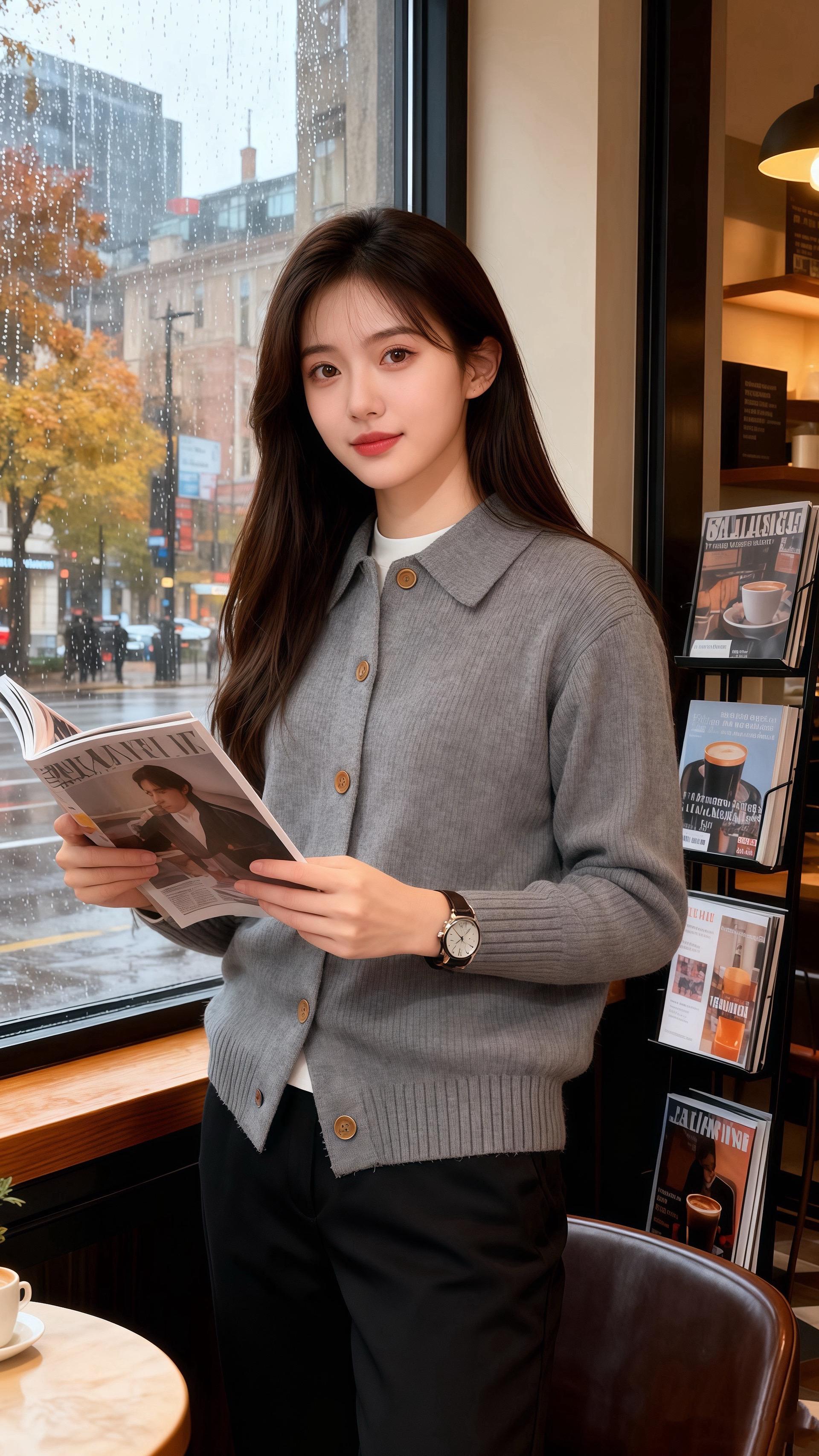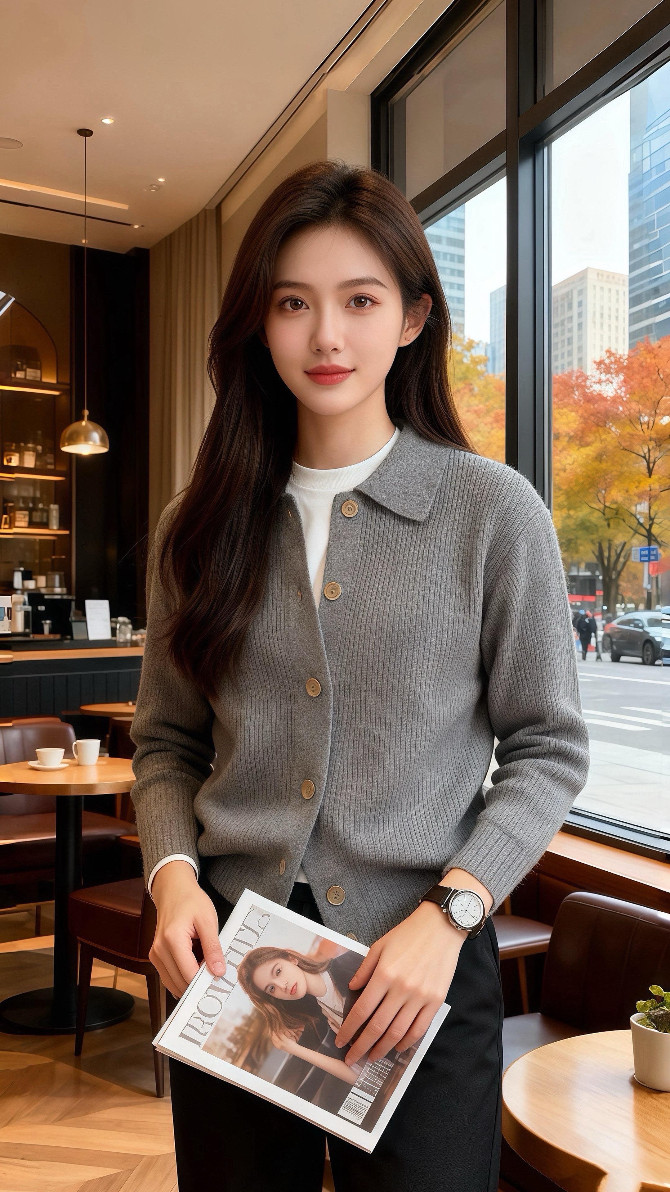 秋日放晴的午后,皓明推开咖啡馆门时,一眼就看见许妍。她穿灰调针织开衫,翻领衬着内搭的白边,像把窗外的秋阳揉软了裹在身上。