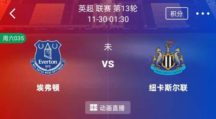 周六 035 英超:埃弗顿VS纽卡斯尔联时间:2025-11-30 1:30场地:希尔·迪金森体育场埃弗顿当前以18分在