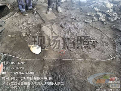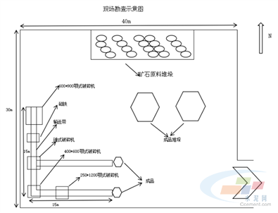 经现场勘查,事故发生地点为丰固水泥公司厂区西南角的破碎车间,为长约40米、宽约30米、高约15米,四面围墙的长方体钢铁结构厂棚。东面开门;西面靠墙由北向南依次安装有600*900颚式破碎机(俗称大机)、磁铁、锤式破碎机和400*600颚式破碎机,中间由输送带连接,总长约15米;南面靠墙并排安装有两条输送带,靠里面的输送带中间有250*1200颚式破碎机(俗称1米机)并连接400*600颚式破碎机,靠外的输送带连接锤式破碎机,总长约15米,输送带向东终端下方呈锥形堆积有已经破碎的少量成品;设备沿西墙、南墙呈7字型连接分布;北面靠墙堆积有矿石原料,长约15米、宽约3米、高约1.5米;车间中间靠东呈锥形堆积两堆成品,直径约4米、高约1.5米。