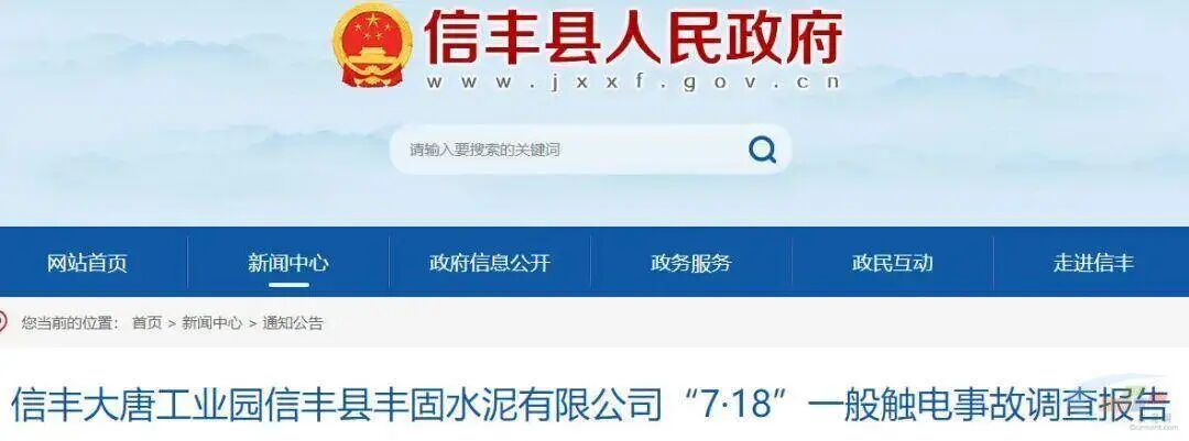 近日,江西省赣州市信丰县人民政府发布信丰大唐工业园信丰县丰固水泥有限公司“7·18”一般触电事故调查报告。