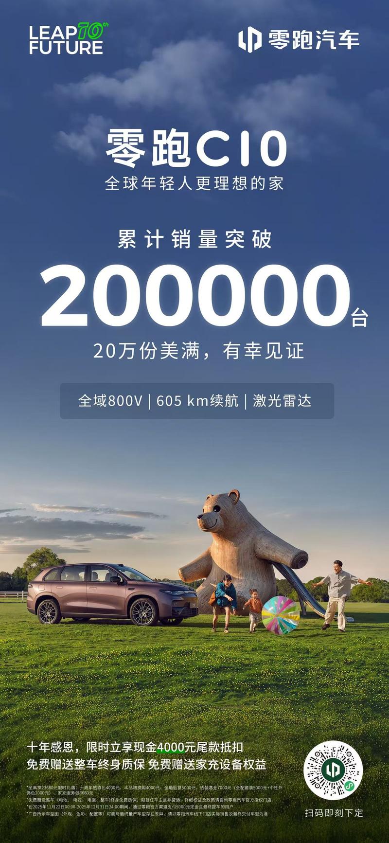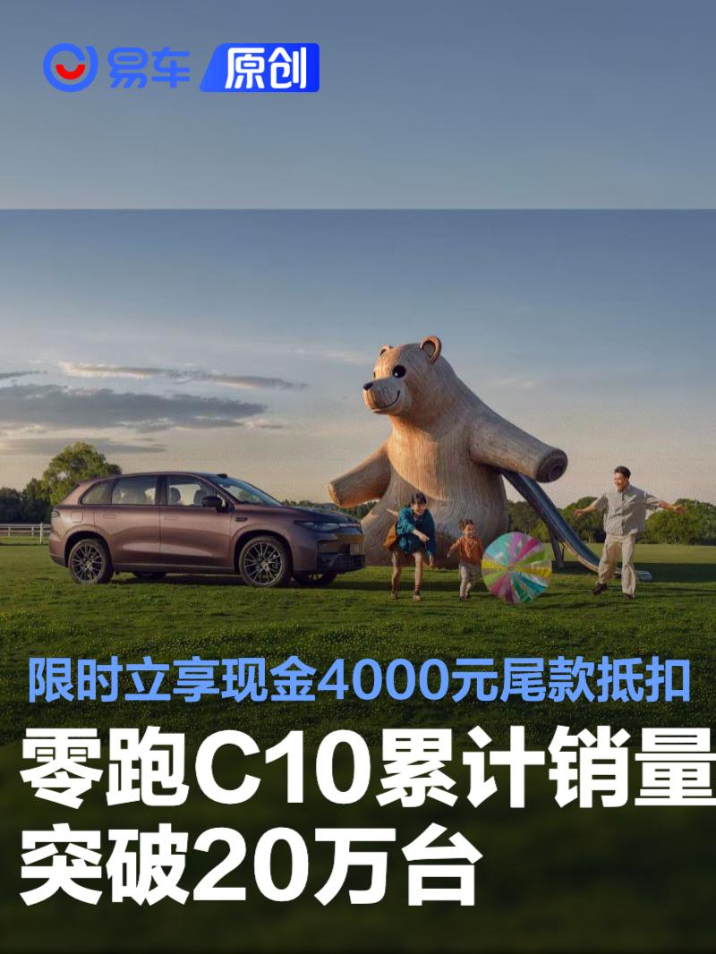 易车讯11月24日,零跑汽车宣布C10累计销量破20万台。十年感恩,限时立享现金4000元尾款抵扣、免费赠送整车终身质保以及免费赠送家充设备权益。