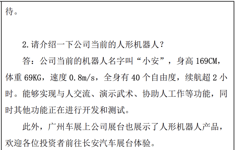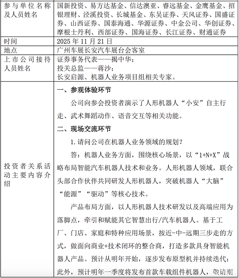 易车讯11月24日,长安汽车发布投资者关系活动记录表,机器人业务规划方面,公司基于工厂、门店、家庭和特种应用场景,按近-中-远期三步走的方式,做面向商业+技术闭环的整合商,打造多款具身智能机器人产品。预计从明年开始,逐步发布原型机并持续迭代;此外,预计明年一季度将发布首款车载组件机器人。