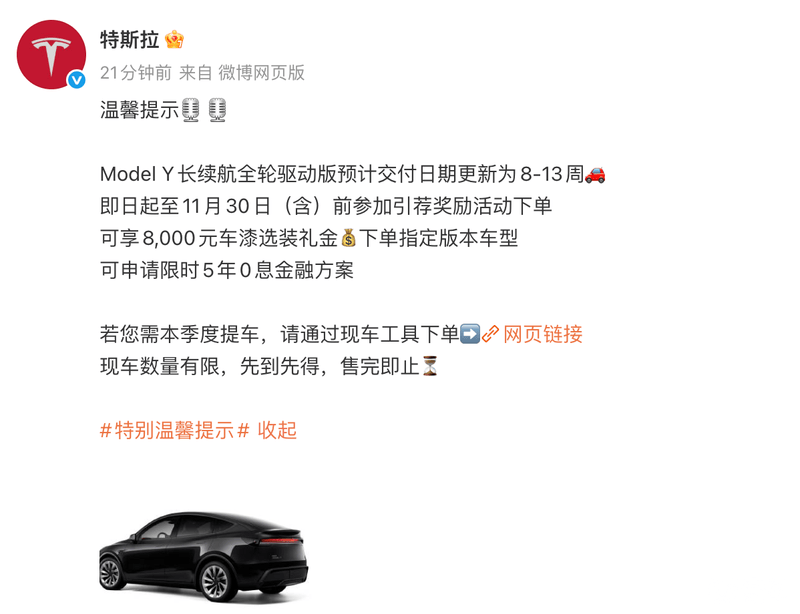 易车讯今日,特斯拉发文称:ModelY长续航全轮驱动版预计交付日期更新为8-13周。即日起至11月30日(含)前参加引荐奖励活动下单,可享8000元车漆选装礼金;下单指定版本车型,可申请限时5年0息金融方案。