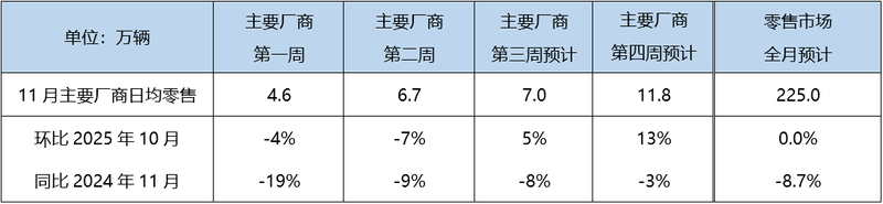 11月车市由于政策调整带来的观望情绪,开局相对平稳。第一周日均零售4.6万辆,同比下降19%,环比下降4%。第二周适逢“双十一”电商购物节,厂商借势促销,日均零售6.7万辆,同比下降9%,环比下降7%。第三周随着广州车展开幕,叠加购置税补贴退坡预期,日均零售预计可达7.0万辆,同比下降8%,环比增长5%。展望下旬,第四周在政策调整预期与厂商年末冲刺共同推动下,市场热度有所回升,但市场仍难以达到去年同期的高度,日均零售预计可攀升至11.8万辆,同比下降3%,环比增长13%。综合各周表现,预计全月零售可达225万,环比0.0%,同比-8.7%。