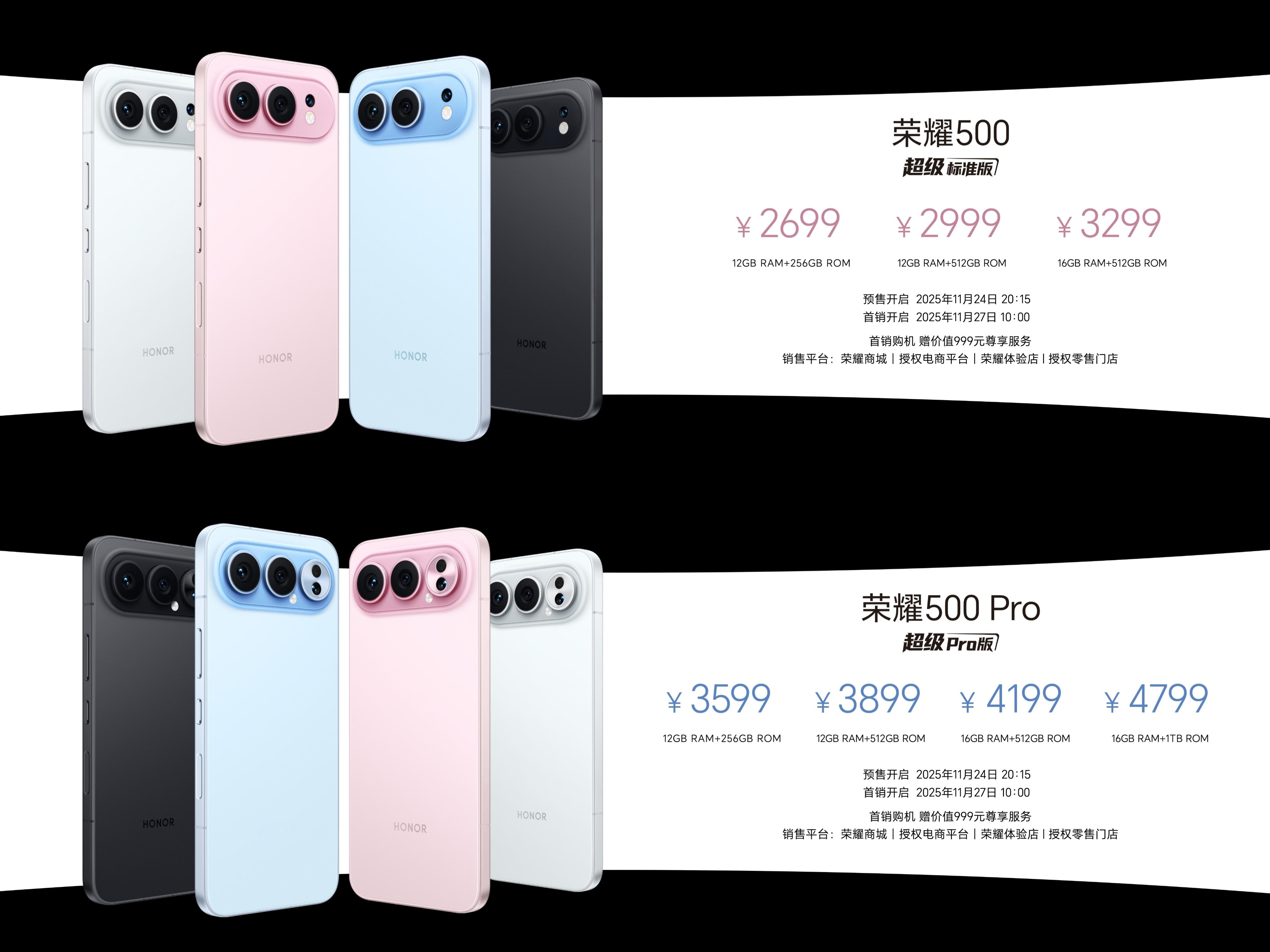 荣耀500系列价格真香,荣耀耳夹耳机2 Pro惊艳亮相11月24日,荣耀新品发布会在杭州盛大举行,荣耀500系列手机与荣耀耳夹耳机2 Pro等新品重磅登场,以卓越性能和创新设计,为用户带来全方位越级体验。荣耀500系列手机无疑是本次发布会的焦点。它共推出超级标准版与超级Pro版两个版本,起售价分别为2699元起、3599元起,现已开启预售,11月27日10:00全渠道正式开售。荣耀终端股份有限公司产品线总裁方飞表示,该系列不止倾听用户声音,更要重塑档位标准。影像上,荣耀500系列全系延续2亿AI超清人像基础,配备档位最大1/1.4英寸大底传感器及1200万超广角镜头,Pro版还带来5000万双防抖长焦镜头,支持CIPA5.0旗舰级防抖等级,拍摄超稳超清晰。行业首发前后置Live人像,让live帧帧有虚化、美颜与氛围,还有6种胶片Live可选,Live路人消除功能让动态瞬间免受干扰,4K转Live和“破框而出”Live特效更是带来独特体验。性能方面,超级标准版搭载骁龙8s Gen4芯片,超级Pro版搭载骁龙8至尊芯片,结合荣耀幻影引擎3.0,重载游戏也能满帧畅玩。续航上,全系搭载8000mAh青海湖大电池,刷新档位手机电量纪录,还支持27W有线反充。标准版80W有线快充,Pro版80W有线快充 + 50W无线快充,保障超强体验不断档。荣耀500系列在护眼、通信、系统等方面也表现出色。支持九大荣耀绿洲护眼特性,通信上带来四大校园网专项优化,Pro版搭载自研射频增强芯片HONOR C1 +。系统搭载全新MagicOS 10操作系统,配备档位唯一AI键。外观采用一体冷雕工艺,轻薄机身搭配水晶岛镜头模组,还有IP68等至高防水等级,Pro版配备旗舰同款超声波指纹。一同发布的荣耀耳夹耳机2 Pro同样吸睛。以中式石拱桥为灵感,有三款时尚配色,搭载全新舒适钛拱桥2.0,佩戴舒适无感。音质上,12mm定制双磁单元搭配LCP液晶振膜与Honor空间音频技术,带来沉浸式听感。它还有逆向发声口设计、骨传导单元与AI降噪算法,保障通话清晰。综合续航长达44小时,支持无线充电与快充。智能交互方面,支持左右耳自适应佩戴、来电点头接听、AI实时翻译等功能,国补到手价466.65元。此外,发布会还带来荣耀手表X5、荣耀Earbuds S、荣耀亲选萤蜂Al投影仪Air等多款新品,为用户带来更多选择。荣耀此次新品发布,无疑将在市场上掀起新的热潮。