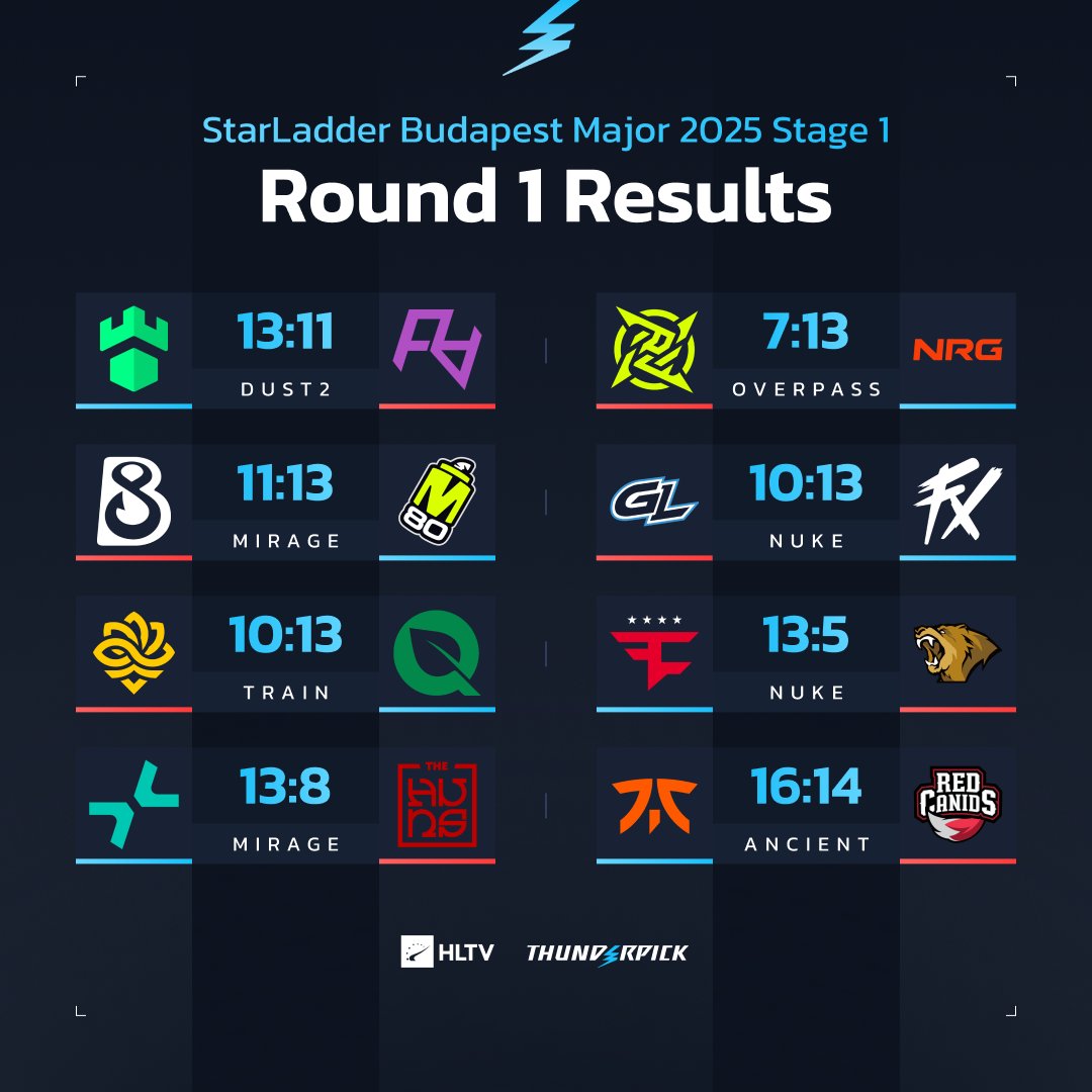 虎扑11月25日讯StarLadder布达佩斯Major第一阶段首轮BO1赛果:
