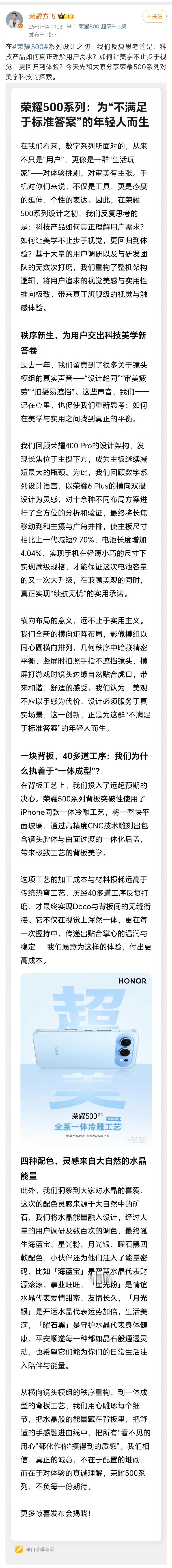 这价格,真的不是写错了吧?荣耀500系列起售价仅2699元,却全系搭载骁龙8系高性能芯片——标准版为骁龙8s Gen4,Pro版更是直接上骁龙8 Elite,性能表现稳居同档前列;影像方面同样越级,全系搭载2亿AI超清主摄,支持4K超清Live拍摄,电影级美颜、动态虚化、“破框而出”Live特效一应俱全,随手记录也能质感拉满。更贴心的是屏幕体验:全系采用1.5K超清分辨率绿洲护眼屏,色彩精准、亮度充足,有效缓解长时间刷题、加班、追剧带来的视觉疲劳,对学生党和职场人群尤为友好。荣耀500系列没有堆噱头,而是把每一分成本都精准投入到用户真实可感的核心体验上。在同档位产品中,它以罕见的全面性和成熟调校,真正做到了“好用、耐看、扛造、拍得美”。这样的质价比,说它是当前最值得入手的机型,毫不夸张。