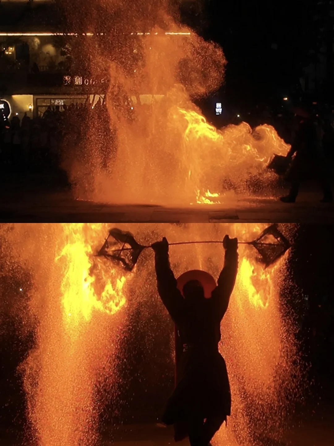 手执炙热铁网,仿佛从远古走来的火之舞者