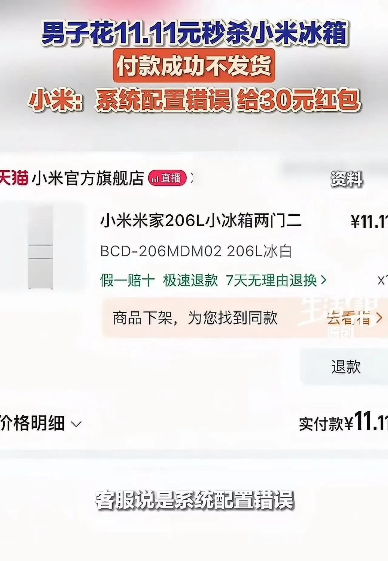 “毫无契约精神!”河南,男子花 11.11 元秒杀小米冰箱,付款成功后不发货。店铺:系统配置错误,给你 30 元红包!男子:把我当要饭的? 张先生攥着手机,盯着小米旗舰店客服发来的“30元补偿红包”,气得直拍桌子! 这年头,网购已经成为人们生活中不可或缺的一部分,但也频频出现让人忍不住吐槽的“坑”。今天的故事,似乎再次揭示了某些商家对“诚信”二字的漠视,也让我们不得不深思:在互联网时代,诚信究竟还值多少钱? 张先生的遭遇,绝不是个例。11.11当天,他满心期待地花了11.11元,秒杀了一台心仪已久的小米冰箱,心想着双十一的优惠果然不容错过。然而,令人失望的是,付款成功后,店铺却突然“系统配置错误”,声称“不给发货”,还扔出一个“30元红包”作为补偿。这个数字,和他花的钱相比,简直就是“笑话”。难道这就是所谓的“诚信经营”?还是商家用“系统故障”遮掩的敷衍和冷漠? 更令人愤怒的是,客服的回应——“系统配置错误,给你30元红包”,仿佛一场闹剧中的“善意调侃”。可这真的是“善意”吗?还是另一种“敷衍”与“推脱”?难道在这个利益至上的商业环境中,诚信已经变成了可有可无的标签?消费者的信任,难道就能用几块钱的红包来“补偿”? 试问,谁愿意被“系统配置错误”所欺骗?谁愿意花钱买到的商品变成了“虚幻的泡影”?更何况,像张先生这样普通的消费者,付出了辛苦的工资,期待的却是一个“诚信的承诺”。他们的期待,难道就这么被“系统故障”轻描淡写地抹杀掉? 这背后,折射出的是一种令人深思的社会现象:在商业的世界里,诚信究竟还值多少钱?是几块钱的红包,还是一份真正的责任感?当我们每个人都在为“诚信”这两个字叫好时,现实中却充满了“套路”和“敷衍”。这不仅仅是个别商家的问题,更是整个行业、甚至社会价值观的缩影。 或许,我们需要的不仅仅是“补偿红包”,更是对诚信的坚守和重视。只有当商家把“诚信”当作底线,把消费者的权益放在第一位,才能真正赢得市场的尊重,也才能让像张先生这样的普通人,心里多一份踏实和信任。 这场“秒杀”变“秒失”的闹剧,让我们再次警醒:诚信,是商业的生命线,也是社会的基石。我们期待未来的电商环境,能少一些套路,多一些真诚;少一些“系统故障”,多一些“人性关怀”。因为,只有这样,才能让每一次购物都成为值得信赖的美好体验。小米零嵌冰箱