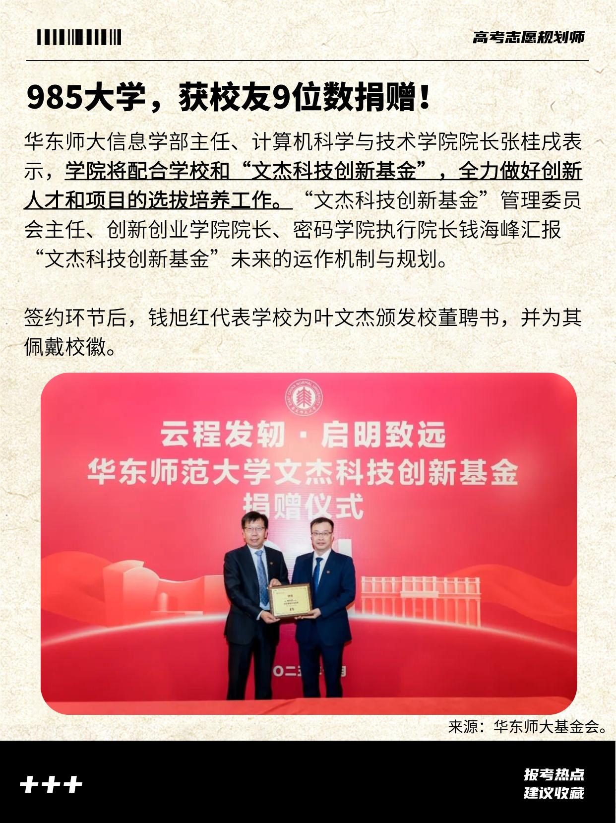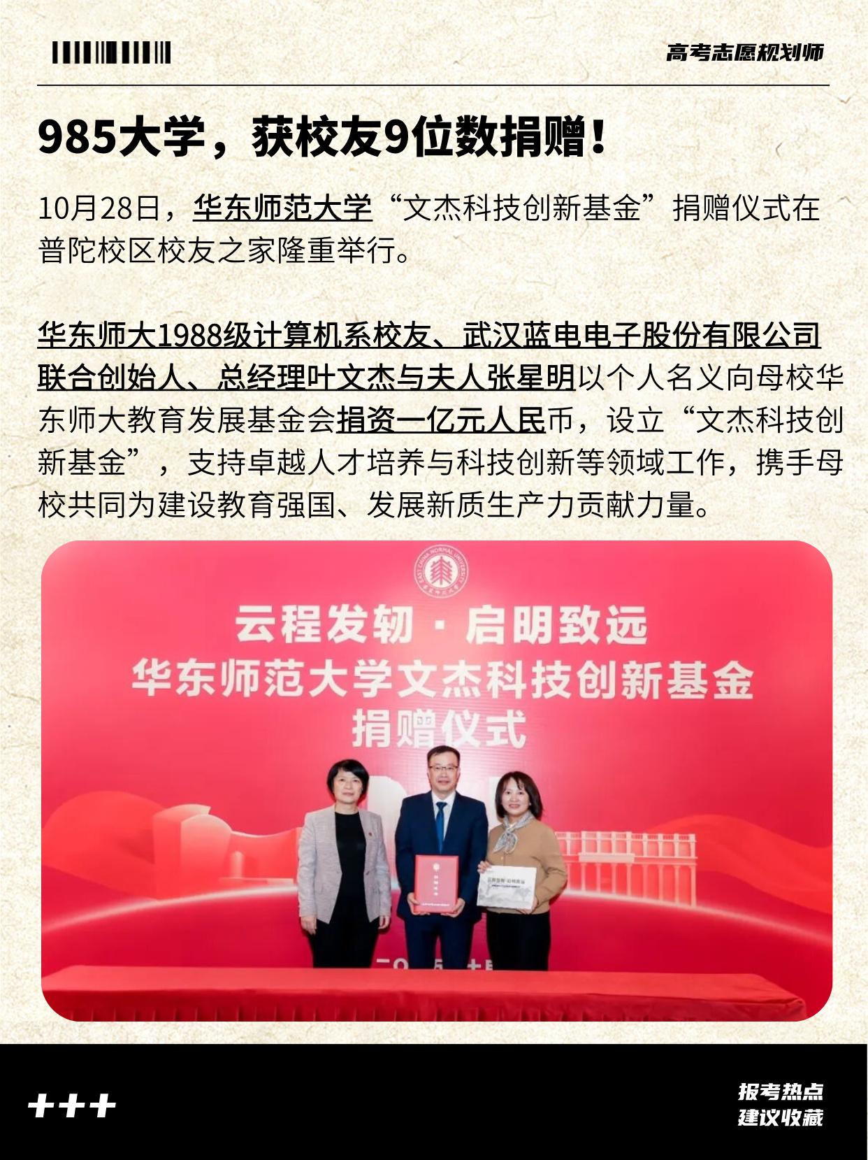 近期热点 985大学,获校友9位数捐赠!华东师大名气又增加了一把。 为什么很多成功人士都热衷于回馈母校?就像雷军经常回武汉大学演讲和捐款一样,我觉得他们更多的是希望大家重视学习,因为是学习 才让他们达到了今天的高度,所以鼓励自家的孩子好好学习 天天向上吧。冬日生活打卡季