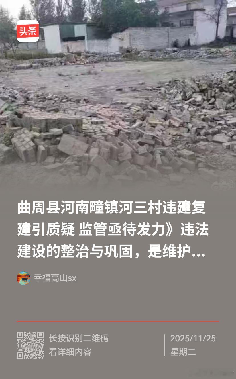 曲周县河南疃镇河三村违建复建引质疑 监管亟待发力》违法建设的整治与巩固,是维护乡村规划秩序、保障公共利益的重要环节。然而近日,有反映称邯郸市曲周县河南疃镇河三村村南一处曾被依法取缔的违建如今竟悄然复工重建,这一现象不仅让周边村民深感不满,也对基层监管的有效性提出了质疑。据群众介绍,该违建此前因未办理合法审批手续、违反乡村规划等问题,被相关部门依法查处并取缔,当时的整治结果曾让村民对规范用地、有序建设抱有期待。但令人意外的是,时隔不久,该地块上又出现了施工迹象,原本被拆除的部分结构被重新搭建,建材、施工设备陆续进场,违规建设行为大有“卷土重来”之势。“刚拆没多久又开始建,这不是明摆着无视规定吗?之前的整治难道成了‘一阵风’?”一位村民的质疑道出了大家的心声。此类已取缔违建的复建行为,性质更为恶劣。它不仅浪费了前期的执法资源,更挑战了法律法规的严肃性和监管部门的公信力,对当地的土地管理秩序、乡村整体规划造成二次破坏,也可能因违规施工、不合规建设再次埋下安全隐患,《中华人民共和国城乡规划法》《土地管理法》等法律法规明确规定,任何单位和个人不得擅自进行违法建设,对违法建筑的查处应坚持“零容忍”,防止死灰复燃。在此,我们强烈呼吁曲周县自然资源和规划局、综合行政执法局、河南疃镇人民政府等相关部门,立即对河三村村南的违建复建问题展开调查。相关部门需迅速核实复建情况,查清责任主体及复建规模,对顶风违法的行为依法从严处理,坚决拆除复建部分,彻底消除违法状态。同时,要深刻反思前期监管中的漏洞,完善长效巡查机制,对已整治的违建区域加强回访督查,严防反弹。唯有以“踏石留印、抓铁有痕”的态度落实监管责任,才能真正遏制违法建设的侥幸心理,维护好乡村的规划秩序与公共利益,回应群众对公平正义的期待。