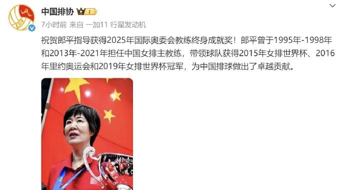 中国排协发文:祝贺郎平指导获得国际奥委会教练终身成就奖