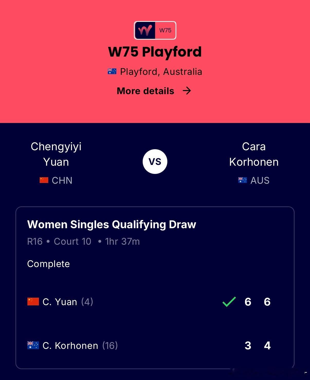 🔵W75普莱福德女单资格赛决胜轮🇨🇳袁程依依6-3/6-4击败🇦🇺Korhonen强势晋级正赛