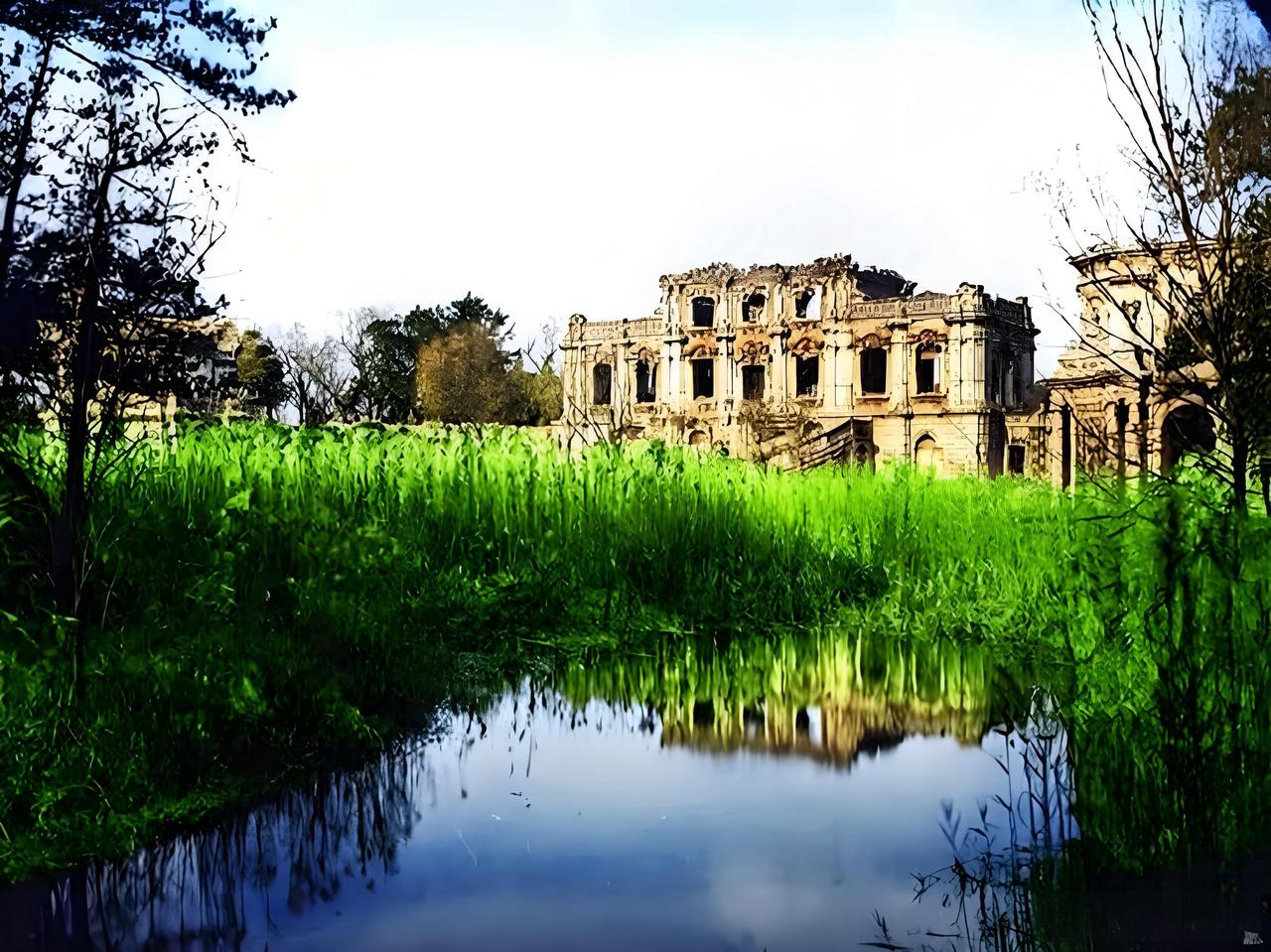 这张照片呈现的是圆明园西洋楼核心建筑谐奇趣的全景残迹,是1860年英法联军焚毁“万园之园”后,这处中西合璧水景宫殿的凋零模样。 作为西洋楼中最早建成的殿宇之一,谐奇趣原本是集西式建筑、喷泉水景与东方园林于一体的全景盛景:殿宇采用巴洛克风格的墙体、窗洞,搭配环绕的池塘水景,曾是清帝赏玩的雅致之所。但画面里,昔日规整的殿宇只剩破碎的建筑骨架——墙面空洞、结构坍圮,原本作为水景核心的池塘被荒苇侵占,残迹的轮廓落寞地倒映在池水中,与周围萧瑟的树木交织出一片荒芜。