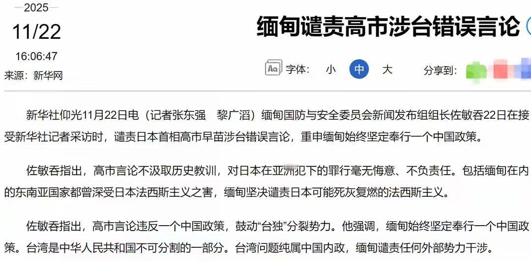日本首相高市早苗妄称“台湾有事即日本有事”,公然挑战一中原则。中国严正警告,解放军将坚决行使自卫权。关键时刻,缅甸、马来西亚、俄罗斯、朝鲜及中亚多国相继发声,强烈谴责日本错误言论,一致重申坚持一个中国原则,力挺中国维护领土完整。多国齐批日本暴露其军国主义复辟野心,国际社会绝不姑息。 评论: 形势逐渐明朗起来,美国虽然不吱声,但是宣布售日武器,变相的支持。欧洲国家估计会不断有表现,在G20𡶶会上,高市早苗相当孤立,心里发慌、发虚,迟到一个小时入场,避开冷落的场面。 历史是一面“照妖镜”,每每关键时刻,妖魔鬼怪总会露出原型。这一次,你总该知道“谁是我们的敌人,谁是我们的朋友”了吧? 东南亚已经战队!马来西亚 越南 泰国 缅甸 老国 印尼 已经战队中国!新加坡 菲律宾美国! 中国身边一众见风使舵的小人。有些傻里傻气一马当先乱议世界朝政,成了那个吃瘪的出头鸟。其他的奸滑投机,见风使舵,也不算什么好鸟。