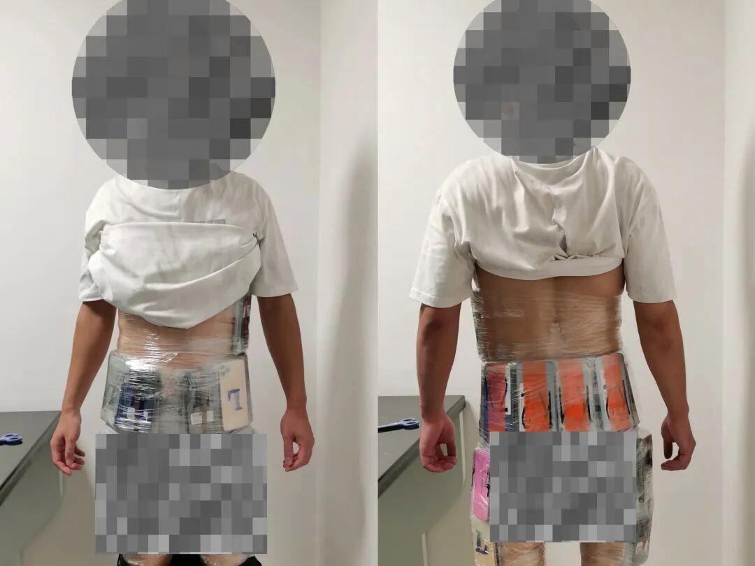 16时10分左右,另一名身着白色长袖衬衫的旅客,自同一现场“绿色通道”进境,神色紧张,关员也在其腹部及大腿部查获用塑料膜捆绑旧手机38台。