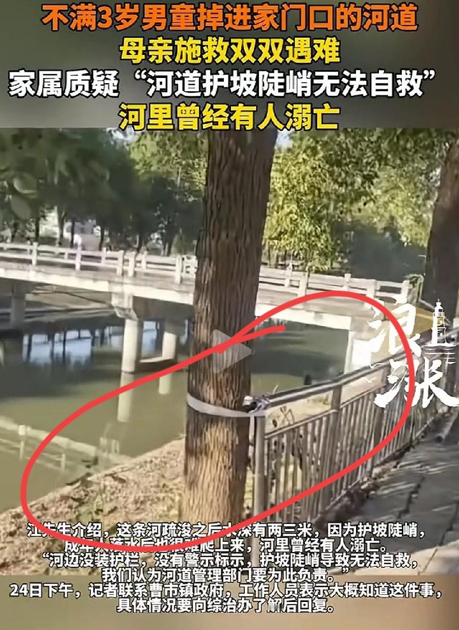 洪湖男童与妈妈家门口溺亡,河道局无责!说河道又陡又滑,可是看现场图片,河坡很缓,大部分还是土坡,就河水边缘很窄的硬化石坡,男童不是突然从河岸掉下去的,自己走下去、下去玩掉下去的,妈妈情急去救人溺亡! 可以看到,这家人安全意识还是很强的,在自家门口岸边装了铁栏杆,可是旁边却都没有装,男童从旁边下去的!像这种情况,家人没看好孩子是主要原因!悲剧警示每一位家长,看护幼童,任何时候千万不要离开视线!