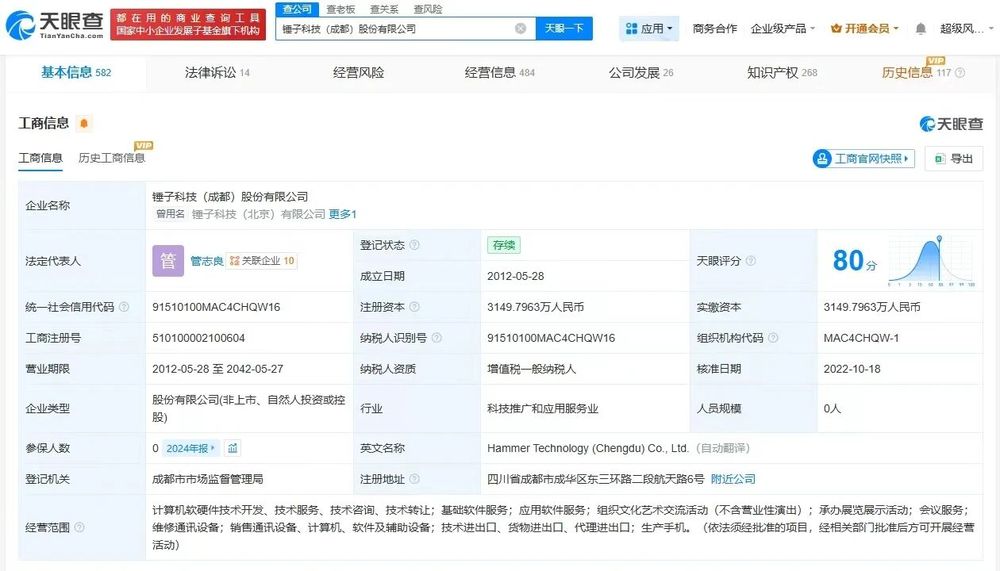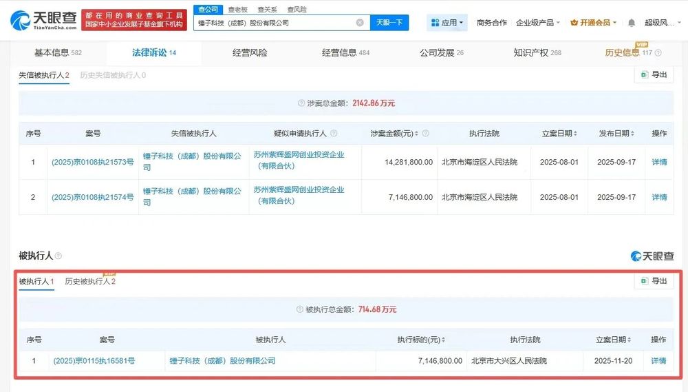 天眼查天眼风险信息显示,近日,锤子科技(成都)股份有限公司新增1条被执行人信息,执行标的714万余元,执行法院为北京市大兴区人民法院。