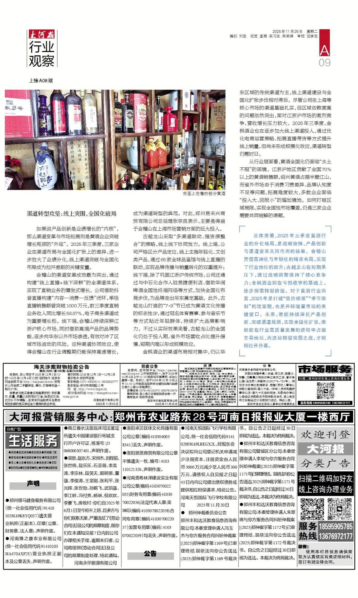 金枫酒业的渠道布局相对集中,仍以华东区域的传统渠道为主,线上渠道建设与全国化扩张步伐相对滞后。尽管公司在上海等核心市场的渠道基础扎实,但区域依赖度高的问题依然突出,面对江浙沪市场的激烈竞争,营收增长压力较大。2025年三季度,金枫酒业也在逐步加大线上渠道投入,通过优化电商运营策略、拓展直播带货等方式提升线上销量,但尚未形成规模化效应,渠道转型仍需时日。
