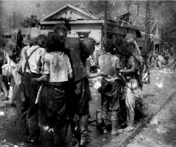 1945年,广岛原子弹爆炸十分钟后的街头,房屋墙体破损、满目疮痍,马路上聚集的幸存者个个衣衫褴褛、浑身沾满尘土污渍,有的用破旧布片遮掩受伤的头部,有的相互搀扶着佝偻起身体,身形慌乱又狼狈。