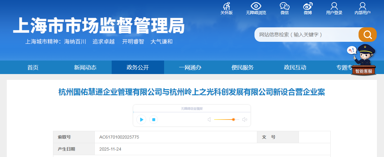 杭州国佑慧通企业管理有限公司与杭州岭上之光科创发展有限公司新设合营企业案