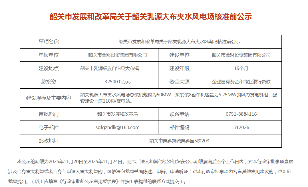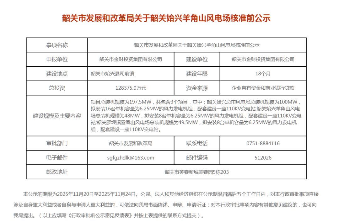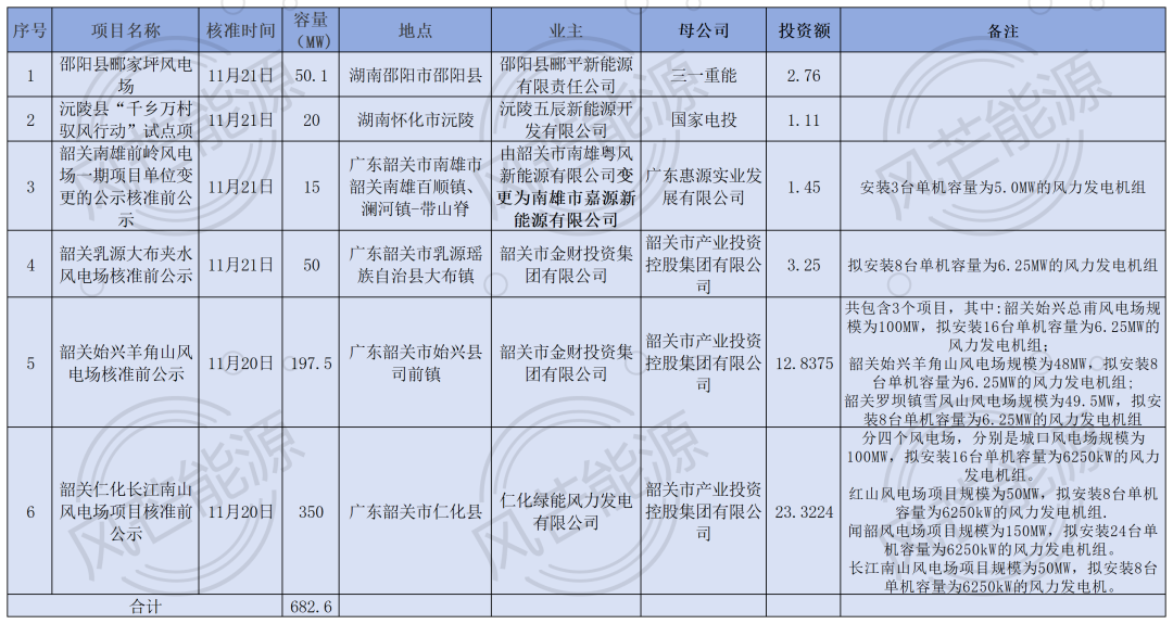 通过梳理,6个项目容量共计682.6MW。业主涉及国家电投、三一重能、韶关市产业投资控股集团有限公司和东惠源实业发展有限公司。其中,广东韶关南雄前岭风电场一期项目单位变更的公示核准前公示为业主变更。