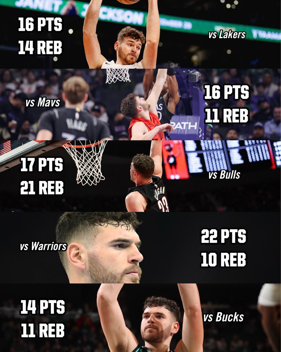 开拓者官方账号报道。多诺万·克林根近期的表现中已包含5次两双数据