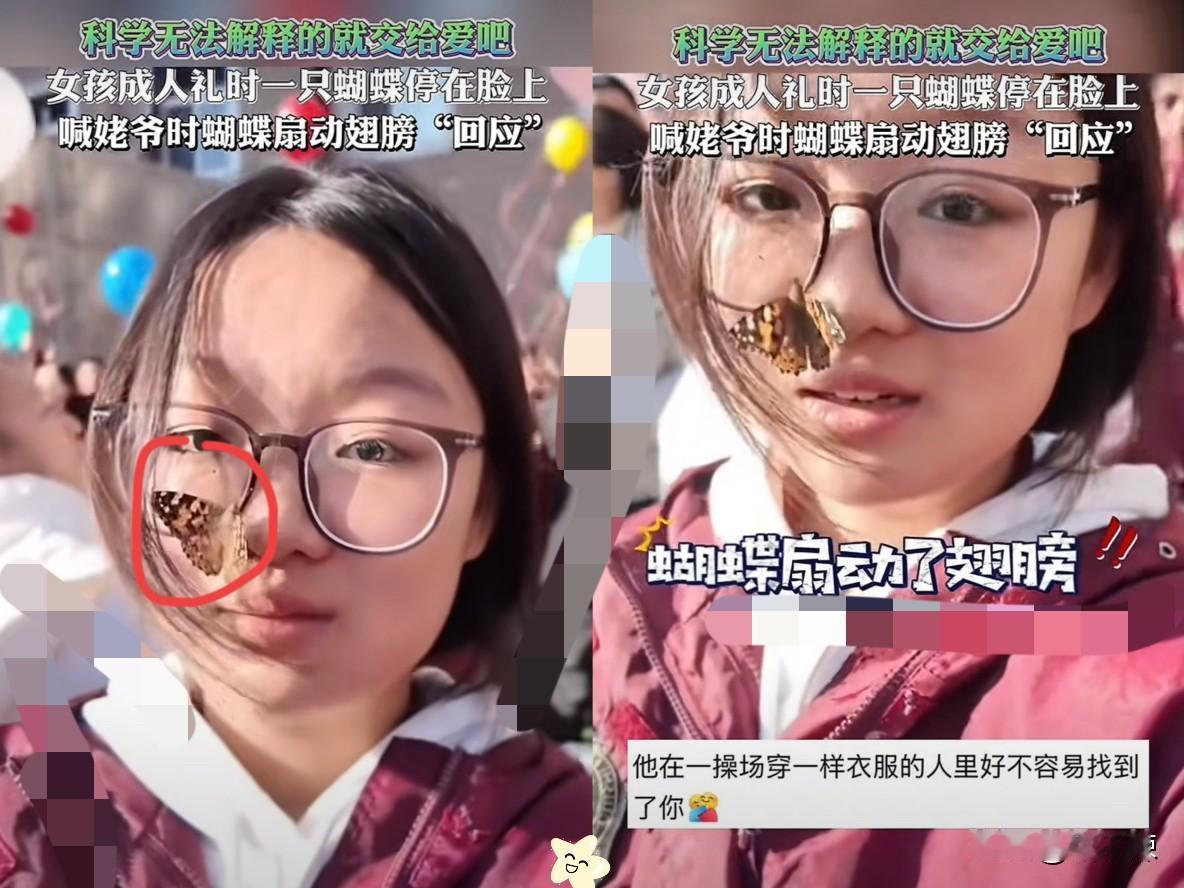泪目了,女儿在学校举行成人礼时,突然一只白蝴蝶突然落在她鼻尖,小姑娘红着眼哽咽:“是不是姥爷来看我了?”妈妈强忍着泪试探:“是孩她姥爷的话,就扇下翅膀”,下一秒蝴蝶轻轻颤动翅膀,母女俩当场泪崩! 姥爷走得突然,没能亲眼见证孙女长大,生前总念叨要送她最珍贵的成人礼! 谁能想到,这份迟到的牵挂,会以如此浪漫又戳心的方式抵达! 蝴蝶停在发梢扇动翅膀的模样,多像姥爷从前温柔摸她头的样子,久久不愿离去! 原来真正的思念从不会消散,那些没说尽的疼爱、没兑现的承诺,都会化作生活里的小确幸,在你最需要的时刻悄悄降临! 它让我们明白,爱的人从未走远,只是换了一种方式守护! ​​有些思念不用刻意提起,它会藏在生活的细节里,在最需要的时候,悄悄给你力量!