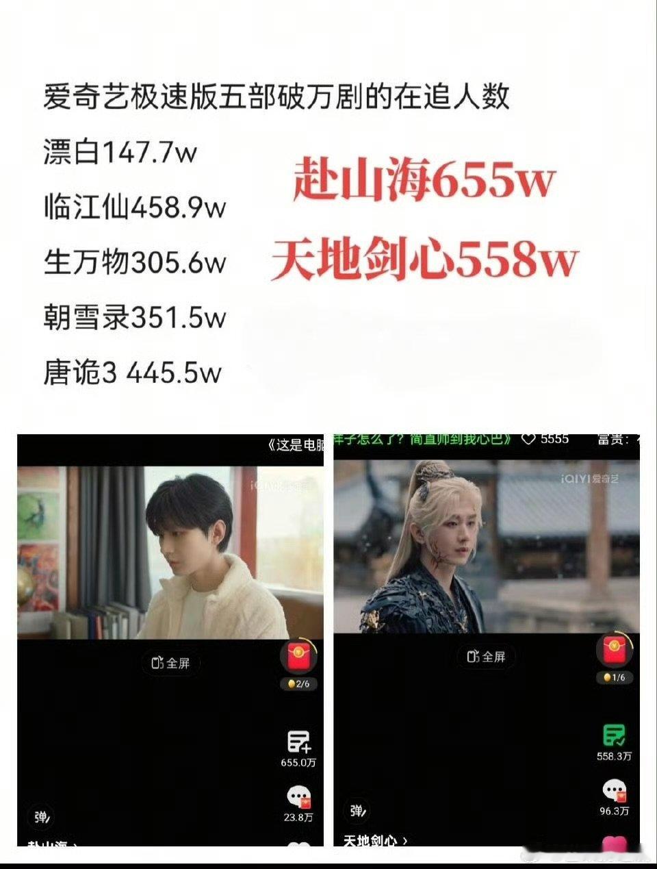 爱奇艺极速版可以看到今年累计在追人数:9月份开播的《赴山海》在双平台联播,在追人数665万,爱奇艺今年所有剧集断层第一(腾讯还有724万)1月份开播的《白月梵星》593.3万,爱奇艺今年第二,10月份开播的《天地剑心》热播期还没过,目前在追人数558.2万,已经爱奇艺今年前三爱奇艺这个在播人数是可以数据佐证为25年累计的看剧人数,非预约人数,可以对比往年剧集。所以,成毅什么剧粉盘,非常客观,成毅两连爆,而赴山海的云包场、讨论量话题量、招商联名ip商业价值、在追人数播放数据等所有数据都是25年最爆的