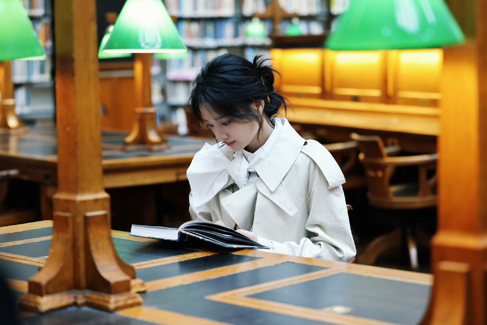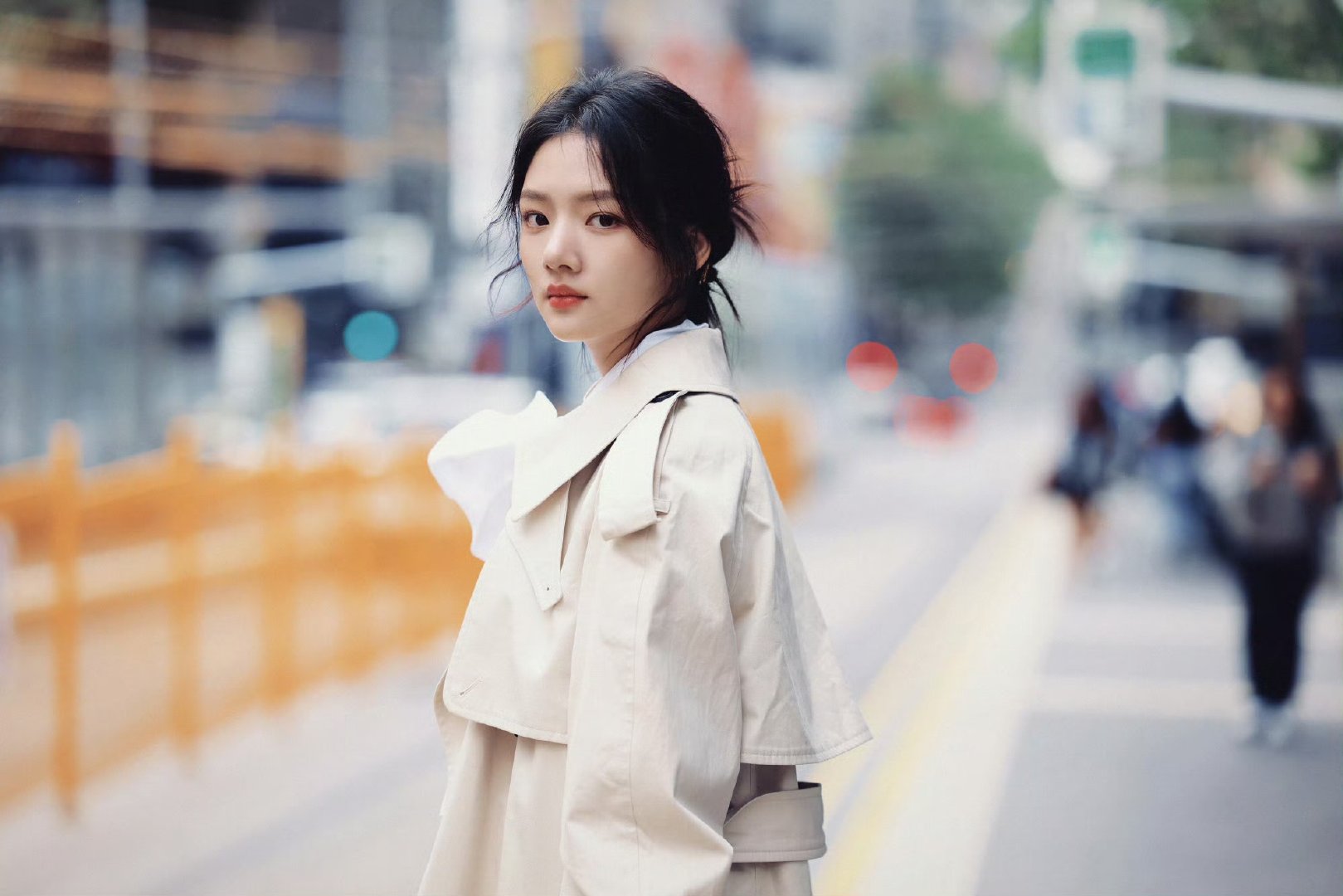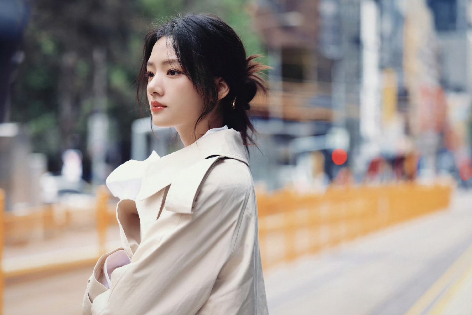 任敏这身浅卡其长风衣配白衬衫,真的好像都市剧女主出街啊!