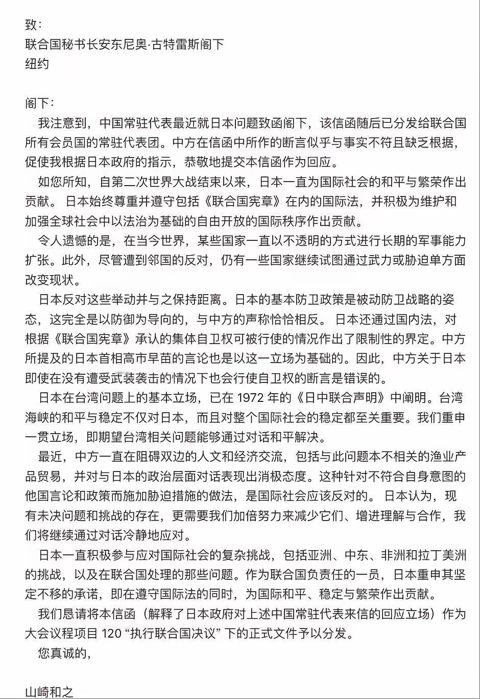 日驻联合国大使效仿中国,致函秘书长古特雷斯。总结一下函件大意: 1.拒不撤回高市