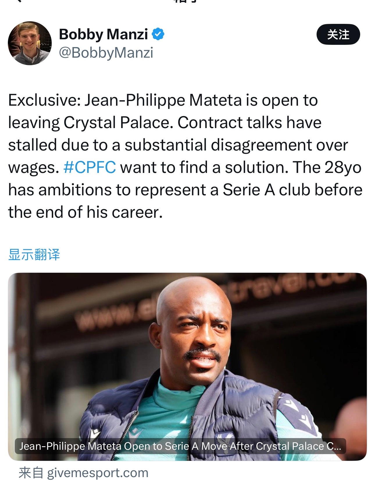 【上树马特塔】水晶宫跟队说马特塔和水晶宫薪资差是距比较大,存在离队可能,并且对意