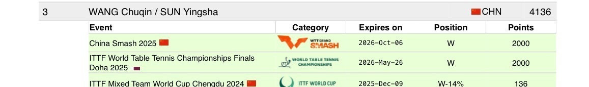 20251125|第48周世界排名更新女单世排第一混双世排第三