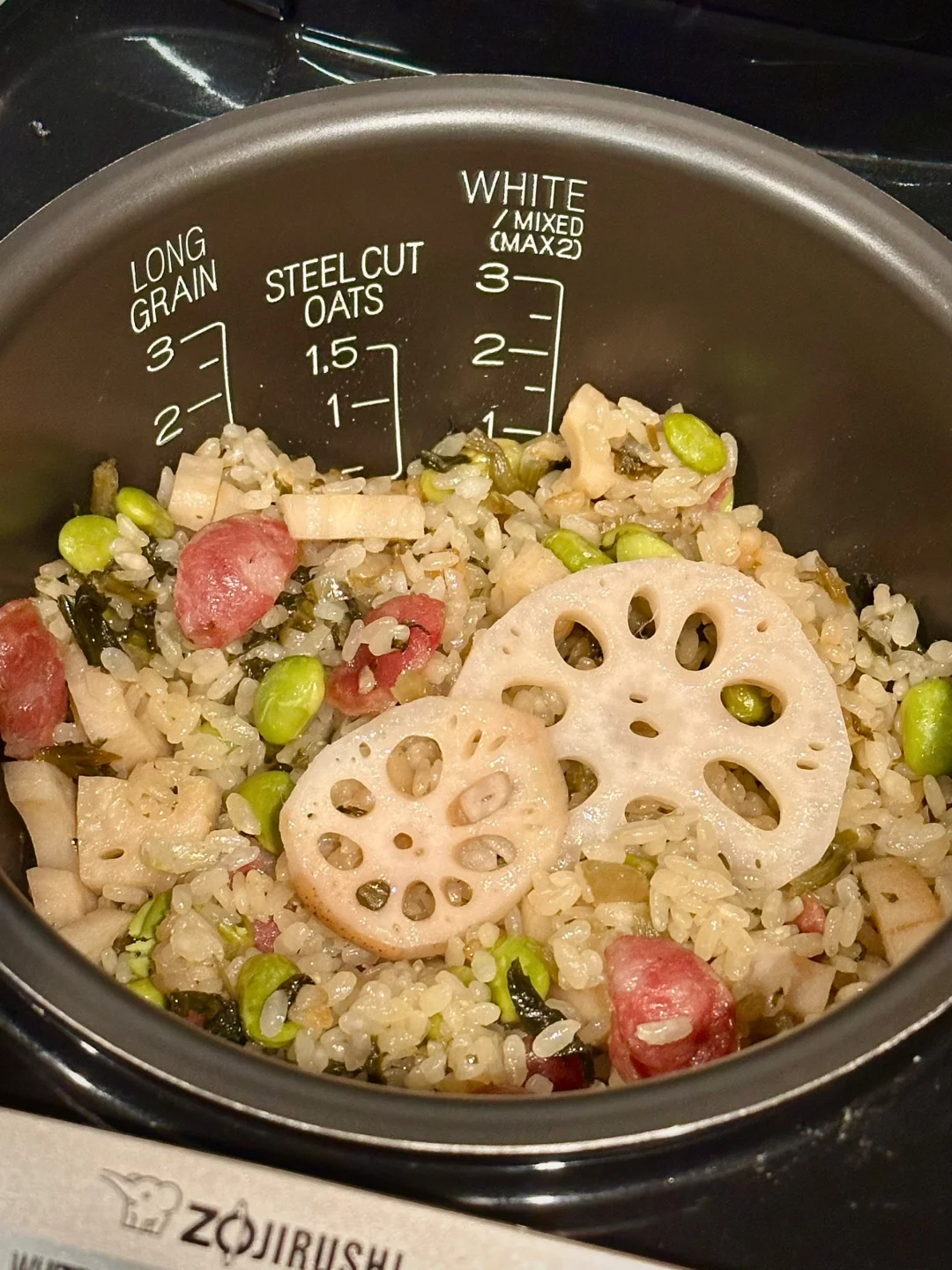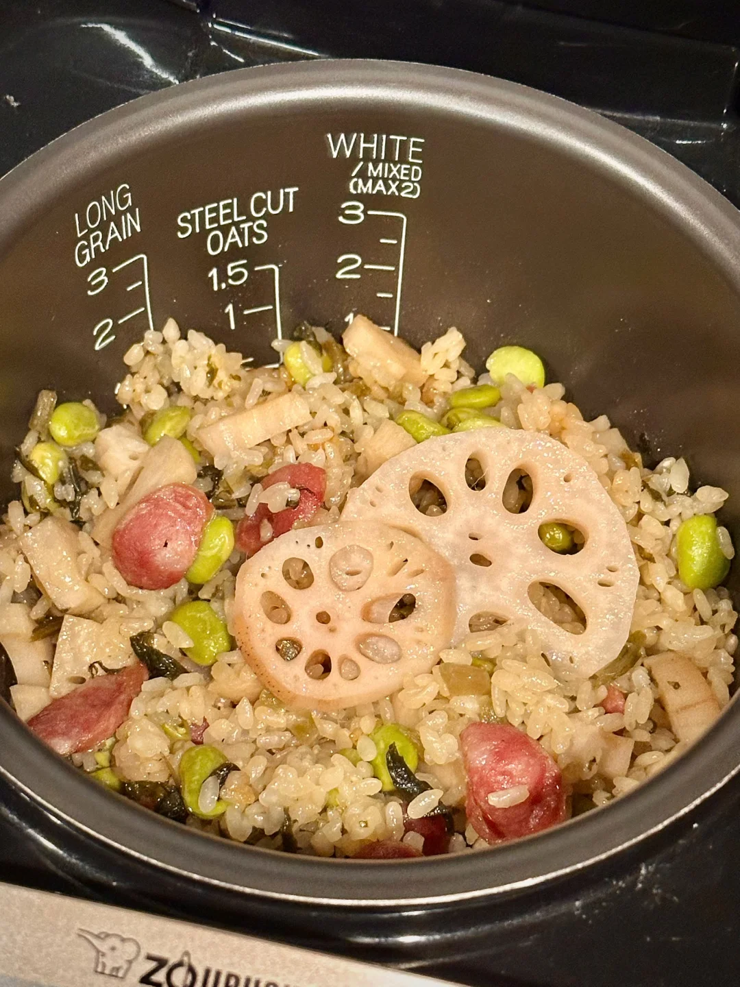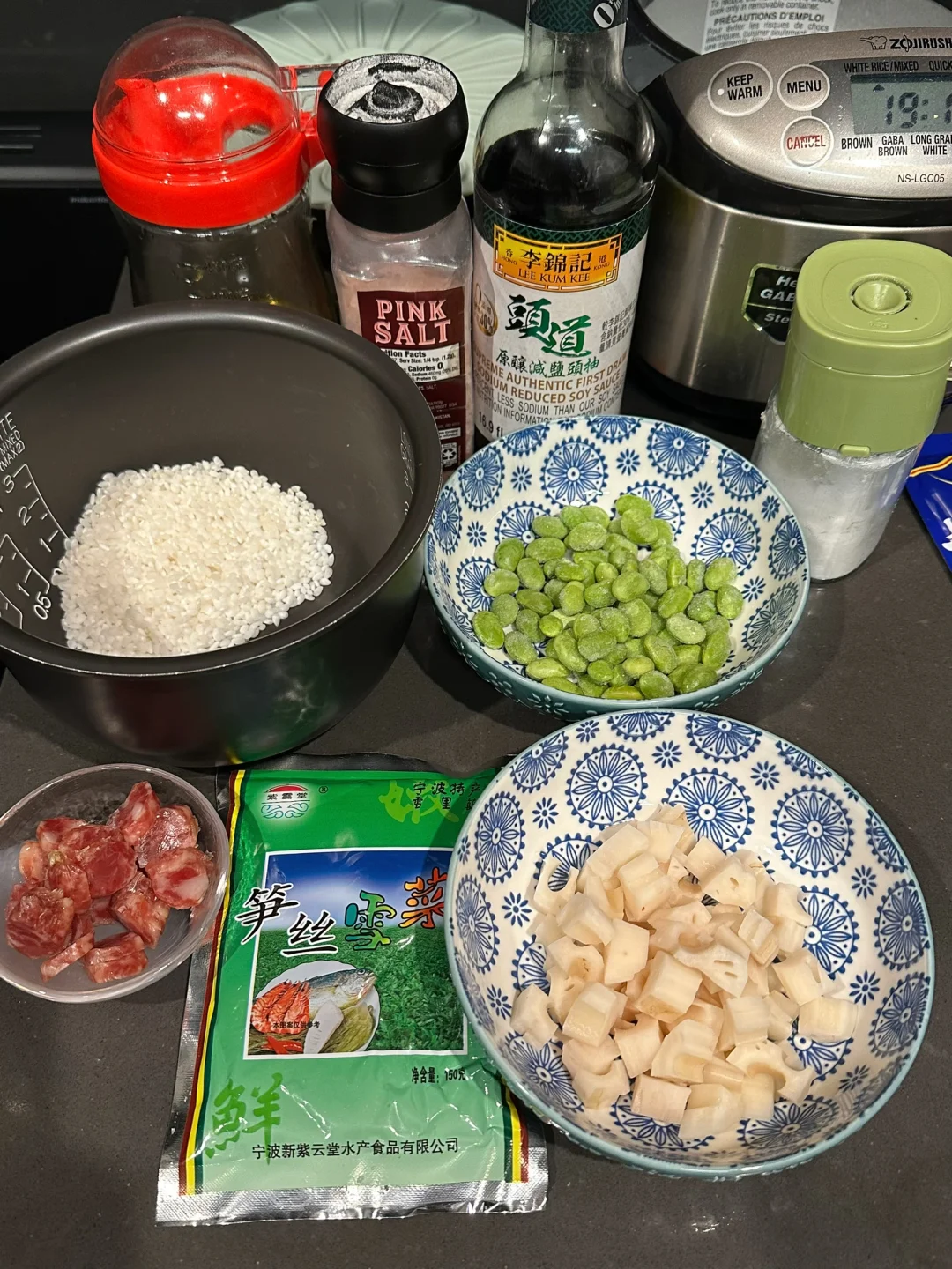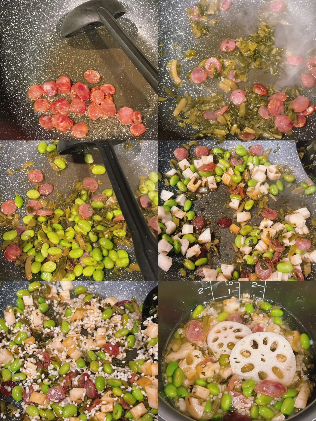 腊肠一根,雪菜小半袋,毛豆一把,莲藕半根,生抽1tbsp,糖1tsp,食用油少量,大米0.5cup