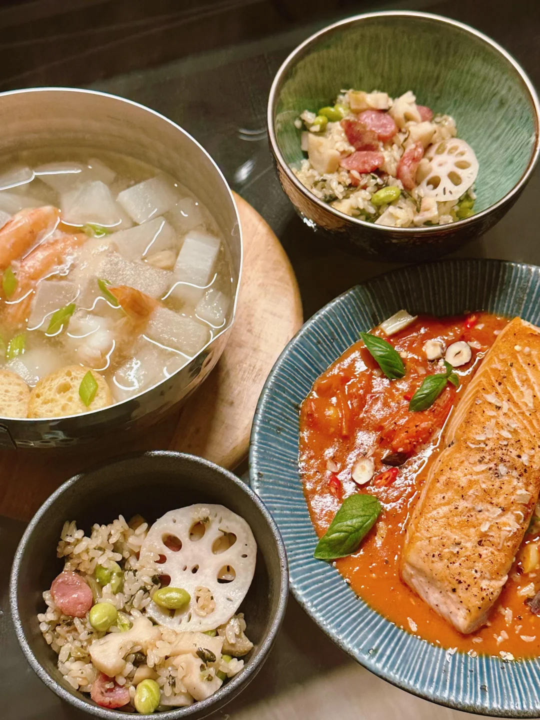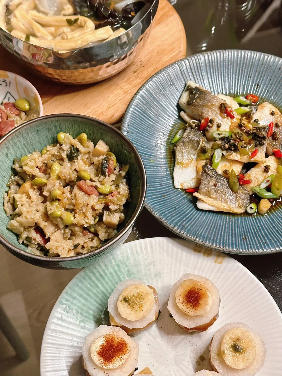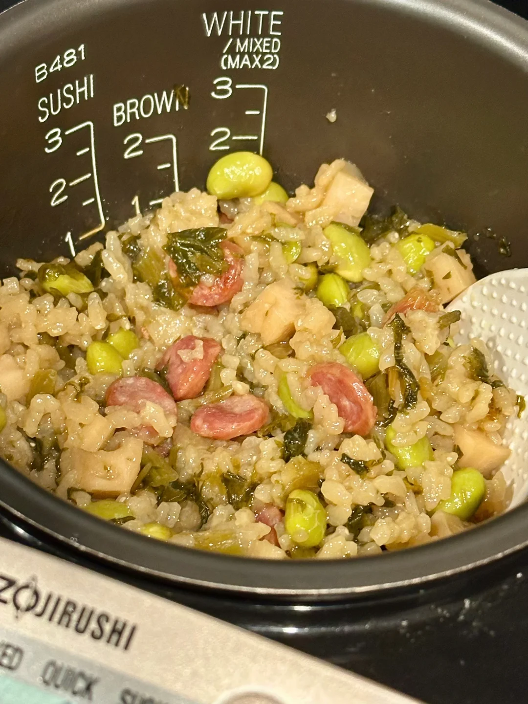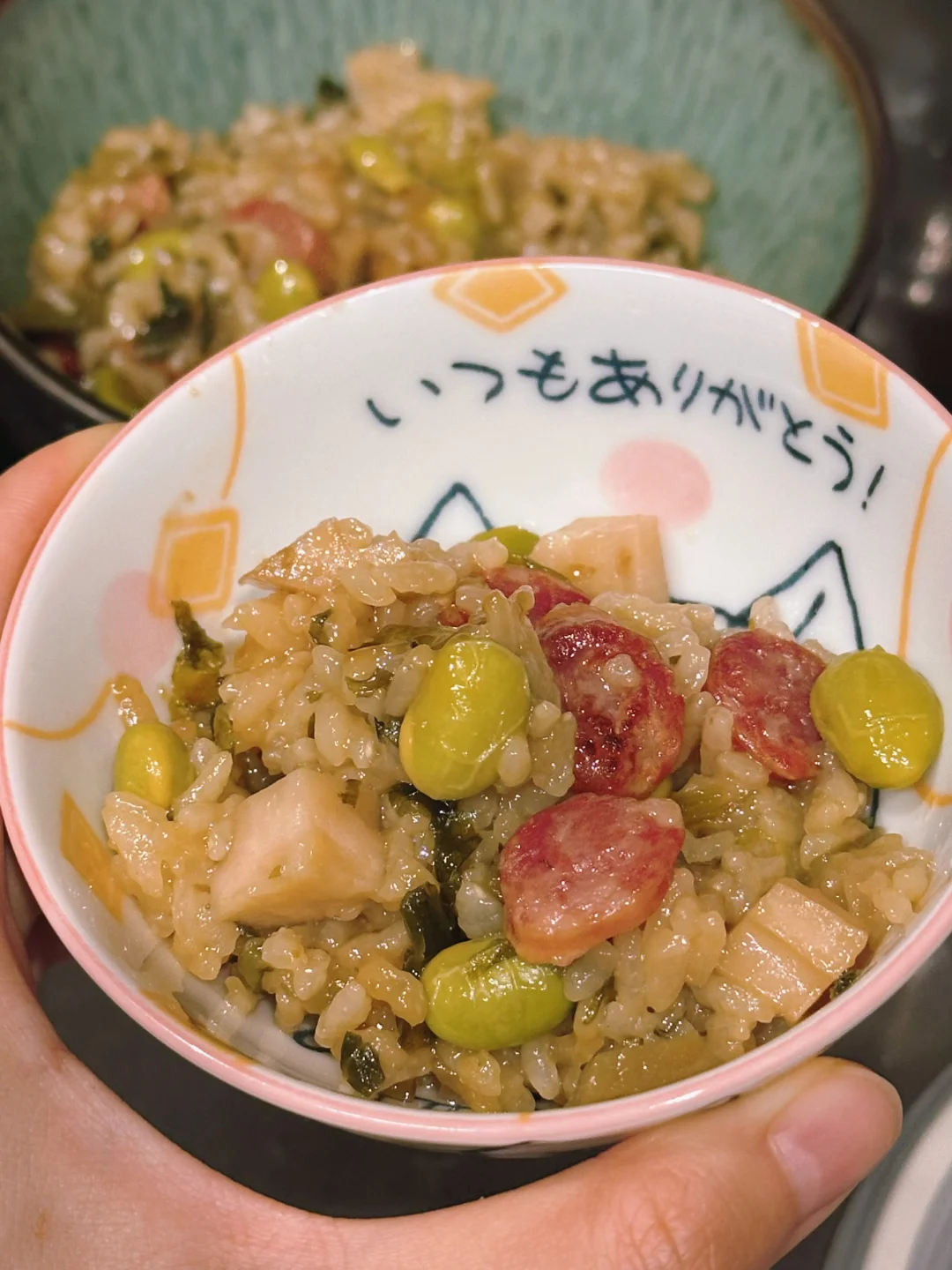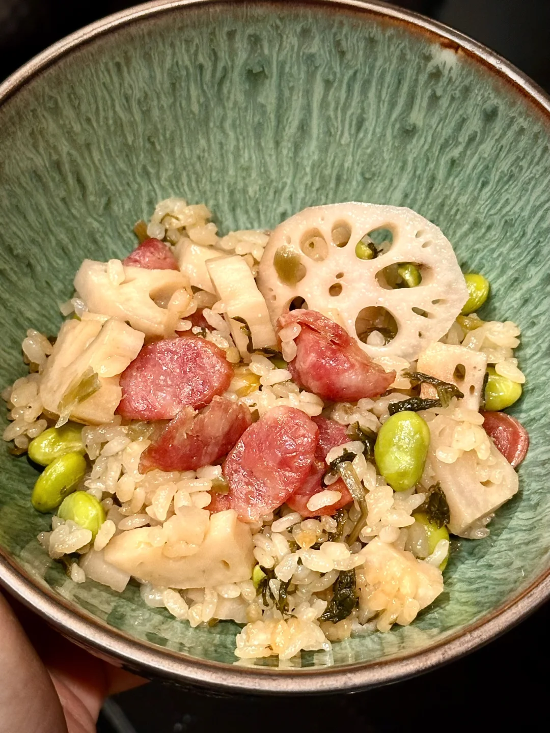 腌制食品和碳水的组合实在美妙,温润的大米让个性尖锐的雪菜有了能落地的熨贴感,油亮的腊肠又让米饭分外香糯。我还特别喜欢毛豆和莲藕的加入,让每一口多了水灵鲜活的感觉。